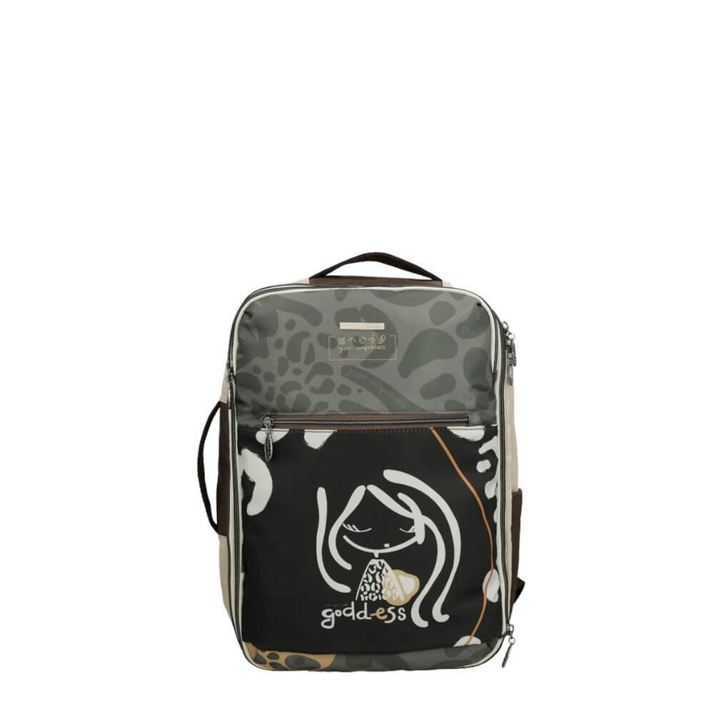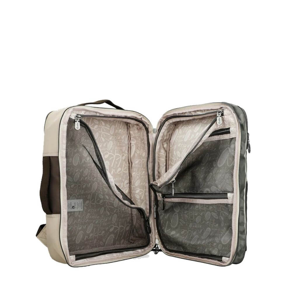 Ο σχεδιασμός του είναι ιδιαίτερα πρακτικός, καθώς διαθέτει περιμετρικό φερμουάρ που ανοίγει σαν βαλίτσα, διευκολύνοντας την οργάνωση και την πρόσβαση στα προσωπικά σας αντικείμενα. Στο εσωτερικό περιλαμβάνει ειδική θήκη για laptop ή tablet, χώρισμα ρούχων με φερμουάρ, καθώς και επιπλέον εσωτερικές θήκες για καλύτερη τακτοποίηση.