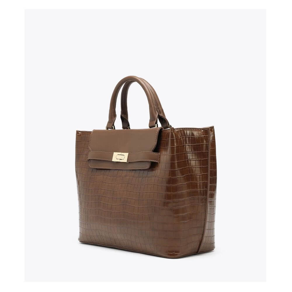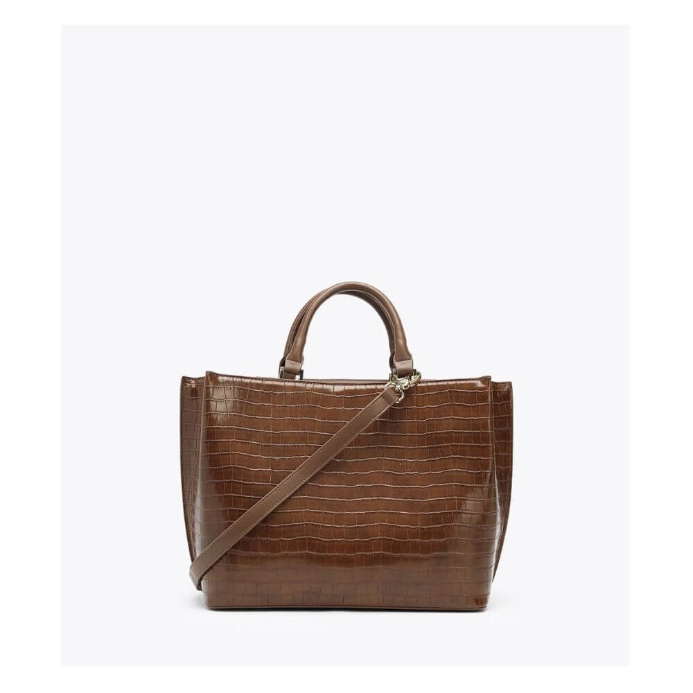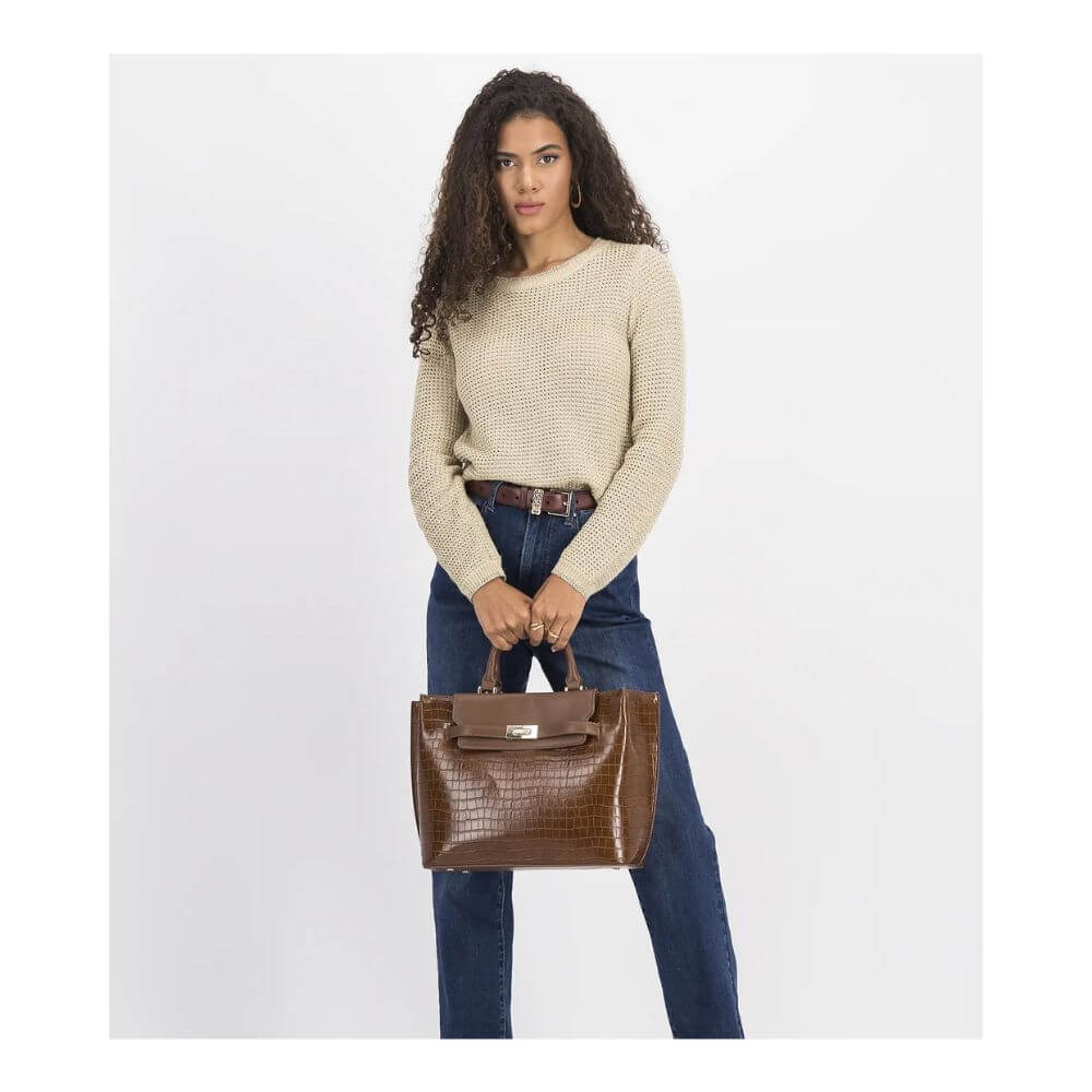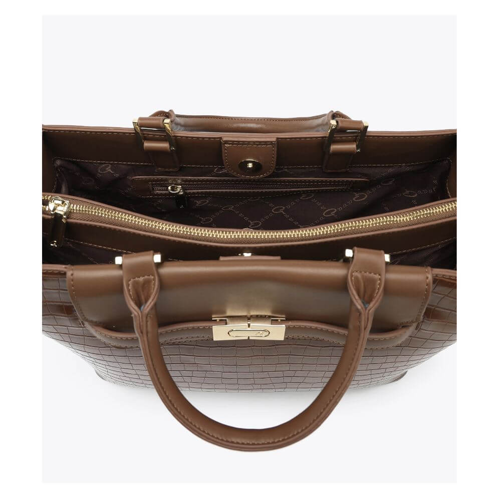 Γυναικεία τσάντα χειρός Penelope της AXEL Accessories, κωδικός 1010-3308 BROWN, μια κομψή επιλογή που συνδυάζει κλασικό ύφος με πρακτικότητα. Το καφέ χρώμα και η κροκό υφή χαρίζουν διαχρονική φινέτσα και την καθιστούν ιδανική για καθημερινές αλλά και πιο προσεγμένες εμφανίσεις.