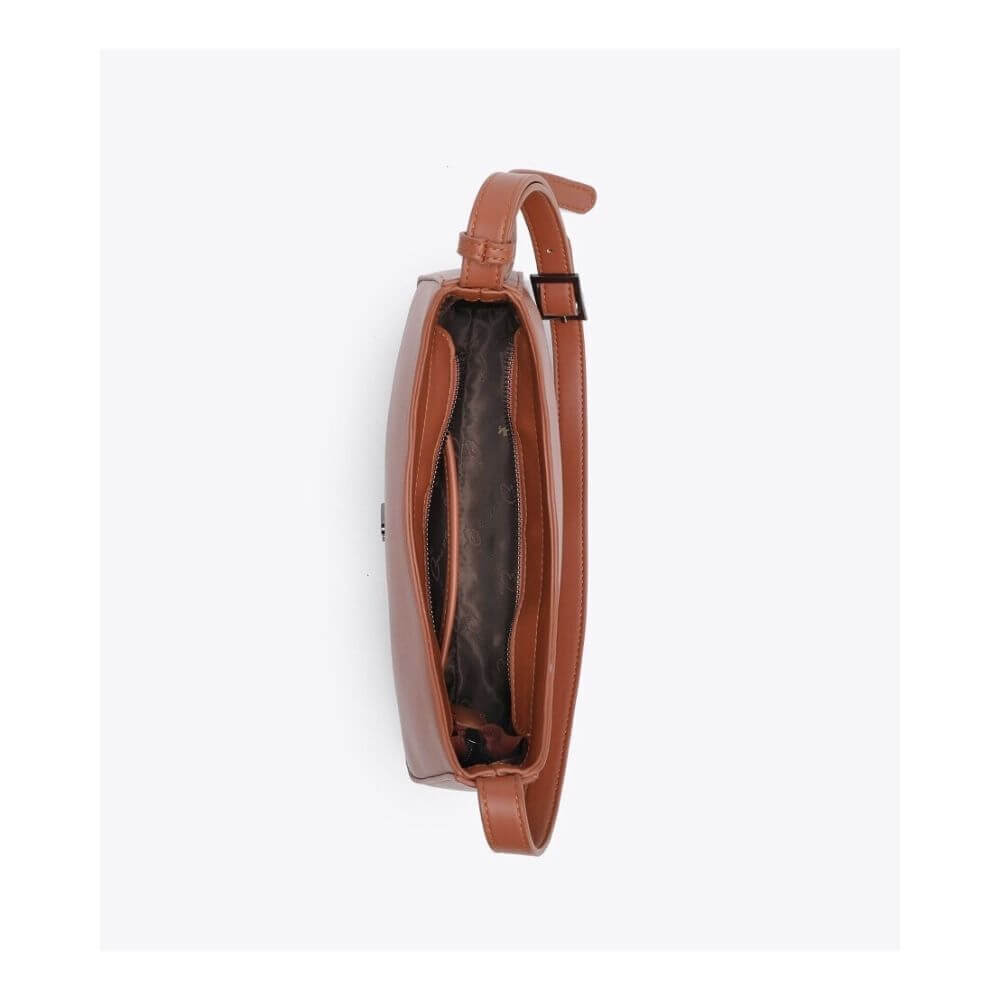 Στο εσωτερικό διαθέτει εσωτερική θήκη με φερμουάρ για σωστή οργάνωση των απαραίτητων. Το ρυθμιζόμενο λουράκι με ιμάντες επιτρέπει άνετη εφαρμογή, ώστε να φοριέται στον ώμο ή χιαστί, προσαρμόζοντας την τσάντα στις ανάγκες της ημέρας.