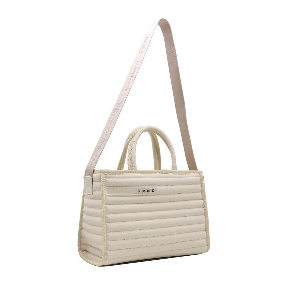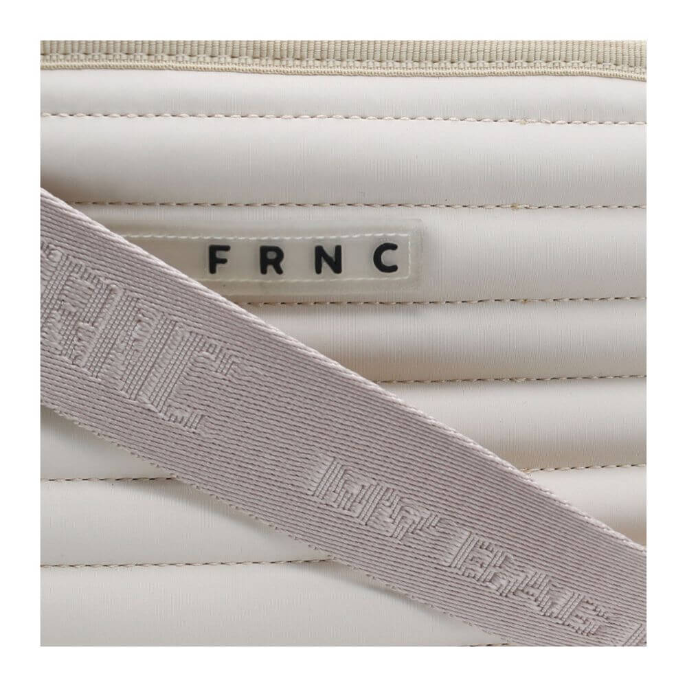 Γυναικεία τσάντα χειρός FRNC σε εκρού χρώμα, κατασκευασμένη από eco leather satin, ένα αδιάβροχο υλικό με σατινέ υφή. Κλείνει με φερμουάρ και διαθέτει ρυθμιζόμενο λουράκι-ιμάντα για άνετη χρήση.