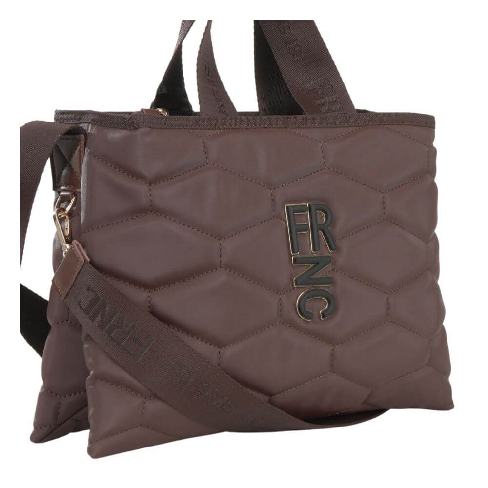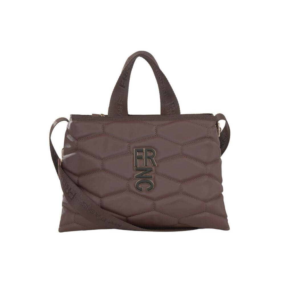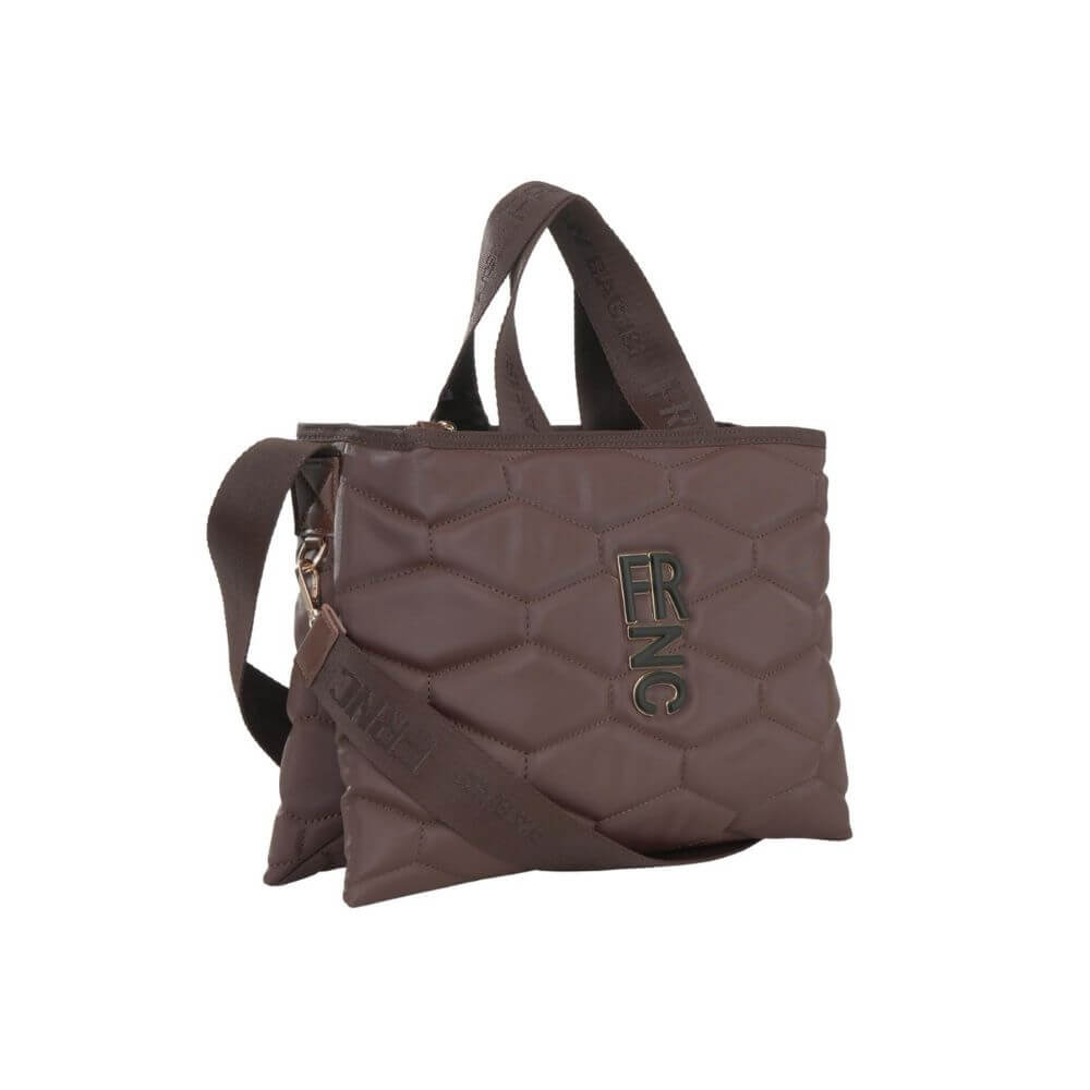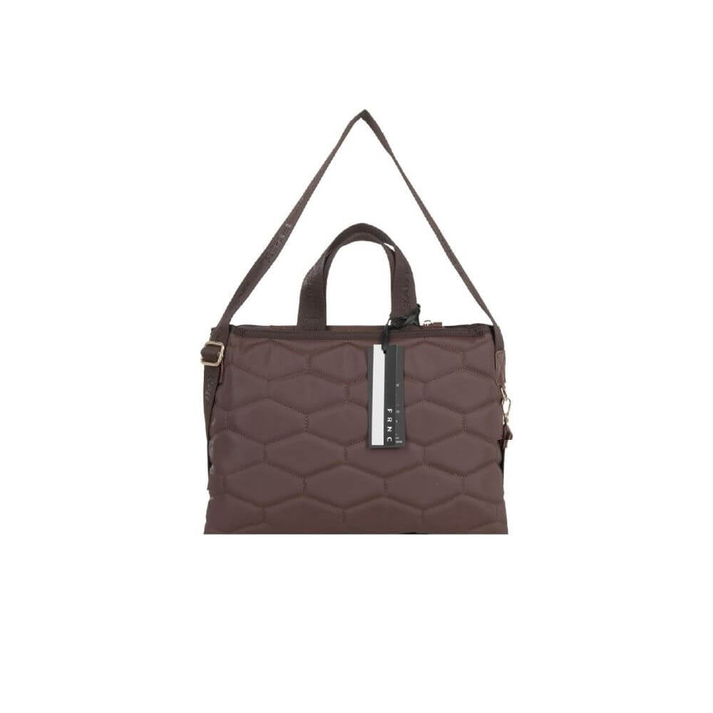 Γυναικεία τσάντα ώμου, χιαστί και χειρός FRNC 4938W σε καφέ χρώμα .Συνδυάζει κομψότητα και πρακτικότητα για κάθε περίσταση. Κατασκευασμένη από eco pelle satin, ένα αδιάβροχο υλικό με εξάγωνο μοτίβο, προσφέρει ανθεκτικότητα και διακριτική πολυτέλεια. Διαθέτει χειρολαβή και μακρύ ρυθμιζόμενο ιμάντα, ώστε να φοριέται άνετα και χιαστί. Κλείνει με φερμουάρ και φέρει μπροστά τα μεταλλικά γράμματα FRNC, που αναδεικνύουν τη μίνιμαλ αισθητική της.
