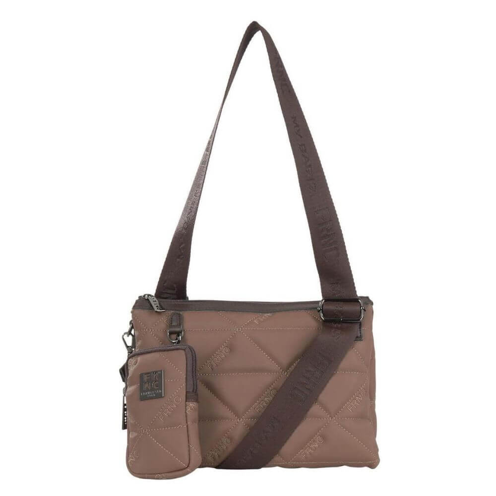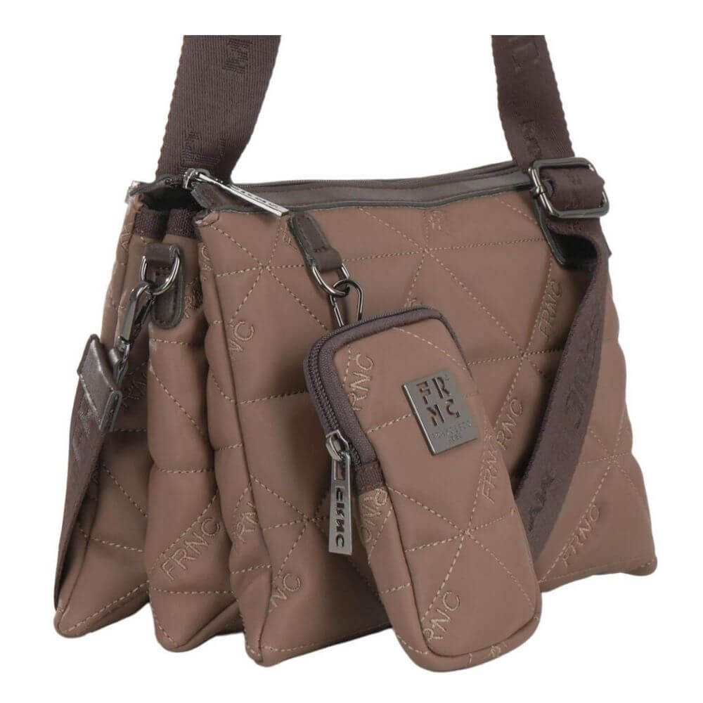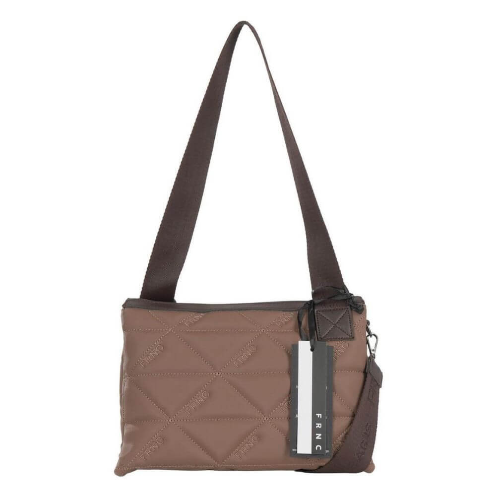 Γυναικεία τσάντα FRNC crossbody, ώμου και χιαστί με κωδικό 4148W, σε κομψό χρώμα πούρο. Κατασκευασμένη από Eco pelle satin, ένα αδιάβροχο υλικό με ανάγλυφο μοτίβο τριγώνου που συνδυάζει διαχρονική κομψότητα και ανθεκτικότητα. Το εσωτερικό της είναι επενδεδυμένο με ύφασμα υψηλής ποιότητας, ενώ το κλείσιμό της γίνεται με φερμουάρ, εξασφαλίζοντας ασφάλεια και ευκολία στη χρήση.