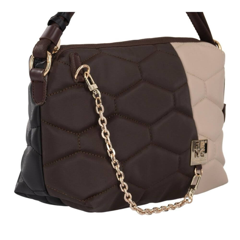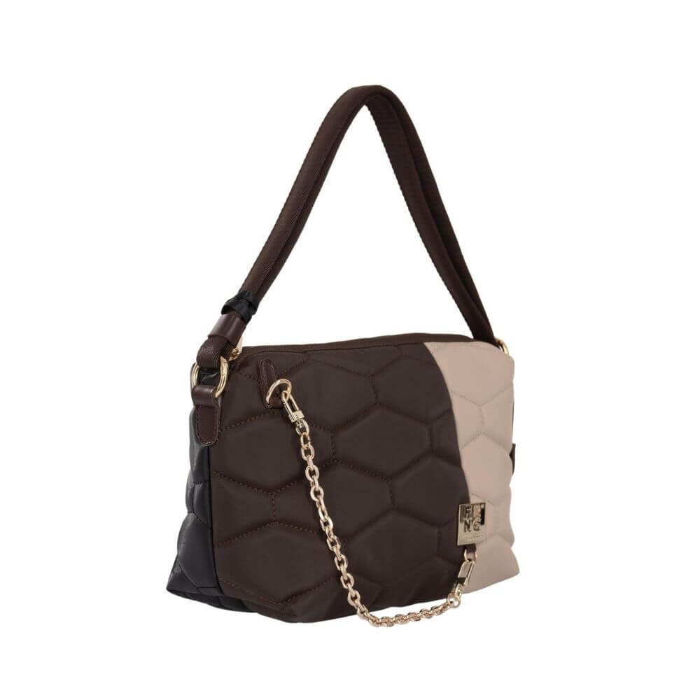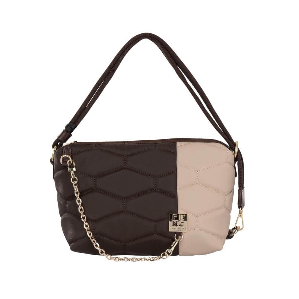Γυναικεία τσάντα ώμου και χειρός FRNC με κωδικό 4930, σε συνδυασμό χρωμάτων μπεζ, καφέ και μαύρο. Κατασκευασμένη από Eco pelle satin (αδιάβροχο υλικό) σε μοντέρνο εξάγωνο μοτίβο, προσφέρει μοναδική αισθητική και πρακτικότητα. Το εσωτερικό διαθέτει φόδρα υψηλής ποιότητας, ενώ η τσάντα είναι 100% χειροποίητη στην Ελλάδα.