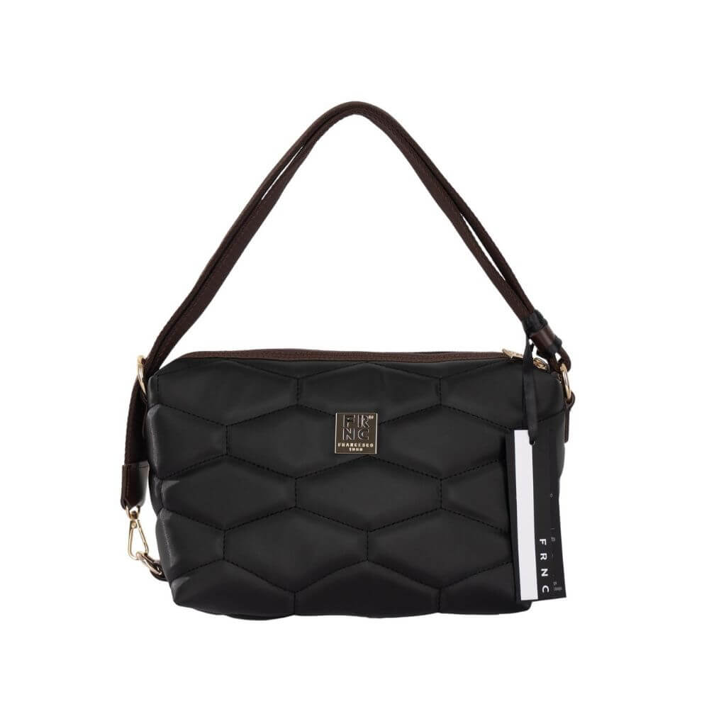 Διαθέτει ρυθμιζόμενο λουράκι-ιμάντα, αποσπώμενη διακοσμητική αλυσίδα και διάτρητο logo FRNC τόσο στο μπροστινό όσο και στο πίσω μέρος, επιτρέποντας να κρατιέται και από τις δύο όψεις. Τα μεταλλικά χρυσά εξαρτήματα προσδίδουν κομψότητα, ενώ το φερμουάρ εξασφαλίζει ασφάλεια και ευκολία.