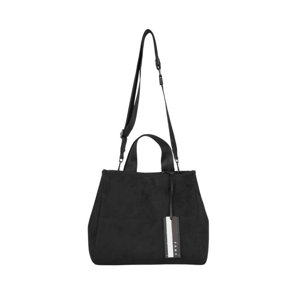 Διαθέτει ρυθμιζόμενο και αποσπώμενο λουράκι-ιμάντα για χρήση και ως χιαστί, καθώς και χειρολαβή για άνετο κράτημα. Κλείνει με μαγνητικό κουμπί, ενώ μπροστά ξεχωρίζουν τα διακοσμητικά ζωνάκια που ενώνονται με μεταλλικό γάντζο και το διάτρητο μεταλλικό logo FRNC. Εσωτερικά περιλαμβάνει χώρισμα στη μέση που λειτουργεί ως θήκη με φερμουάρ, μία επιπλέον τσέπη με φερμουάρ και μία θήκη για κινητό.