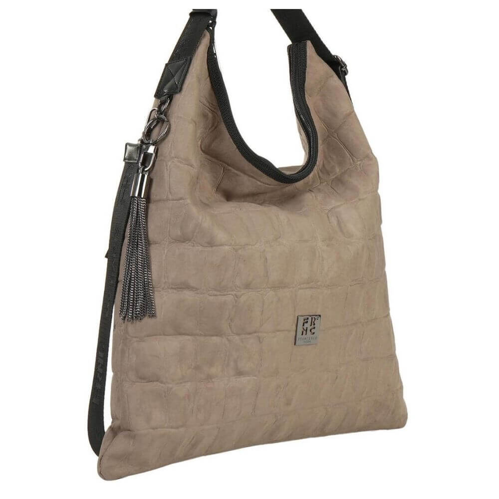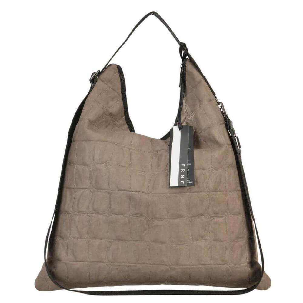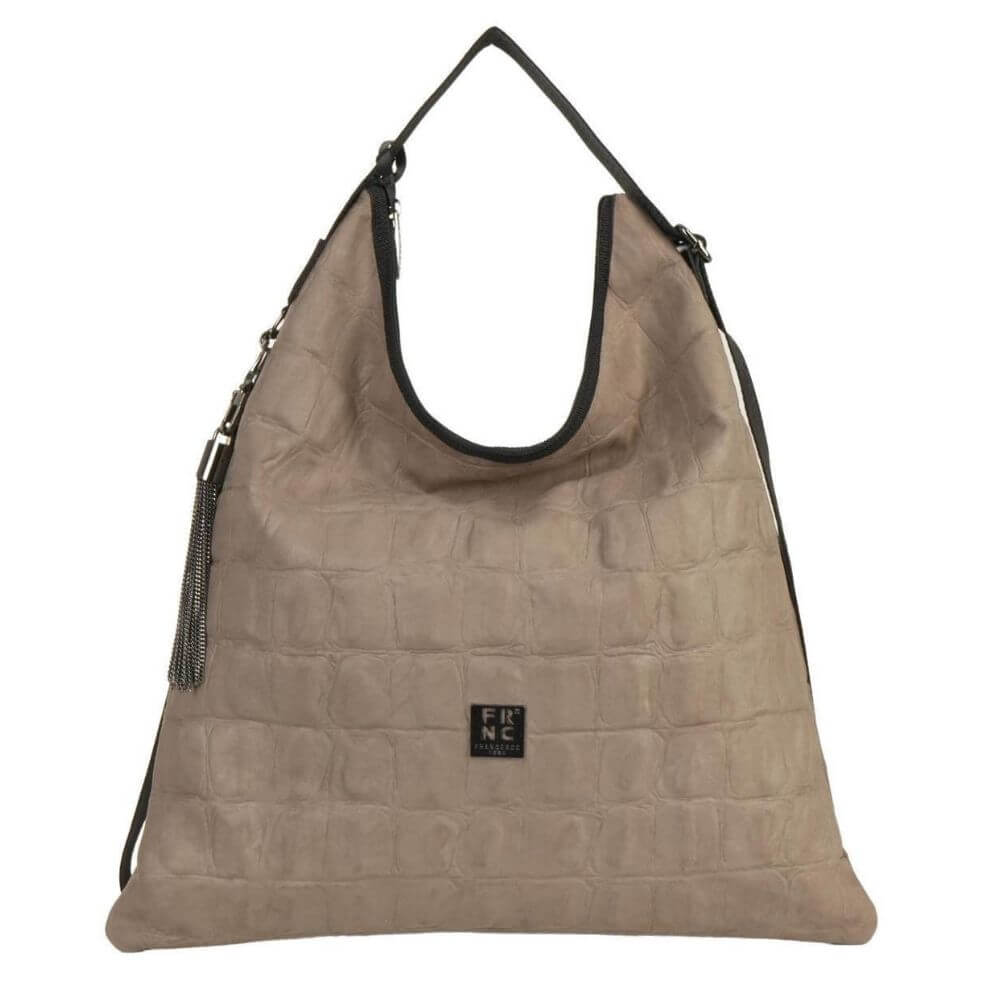Γυναικεία τσάντα shopping ώμου και χειρός μεγάλου μεγέθους FRNC με κωδικό 6142, σε απόχρωση Έλεφαντ. Κατασκευασμένη από Eco Nubuck υλικό με ανάγλυφη υφή και εσωτερικό φοδραρισμένο με ύφασμα υψηλής ποιότητας, συνδυάζει στιβαρότητα και μοντέρνο ύφος. Διαθέτει μακρύ ρυθμιζόμενο λουράκι ιμάντα για χρήση και χιαστί, ενώ το κλείσιμο με φερμουάρ εξασφαλίζει άνεση και ασφάλεια. Μπροστά ξεχωρίζει το διάτρητο μεταλλικό λογότυπο FRNC και στο πλάι το αποσπώμενο μεταλλικό μπρελόκ. Οι διαστάσεις της είναι Μ: 43 cm x Π: 7 cm x Υ: 27 cm. Το εσωτερικό περιλαμβάνει ενιαίο χώρο, μία τσέπη με φερμουάρ και μία θήκη για κινητό. Είναι 100% χειροποίητη στην Ελλάδα και συνοδεύεται από υφασμάτινη θήκη αποθήκευσης FRNC.