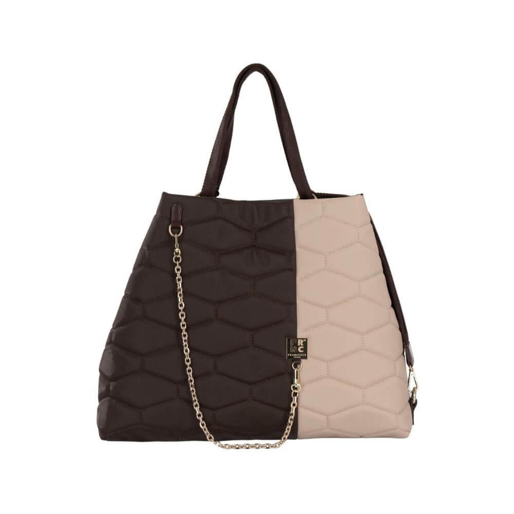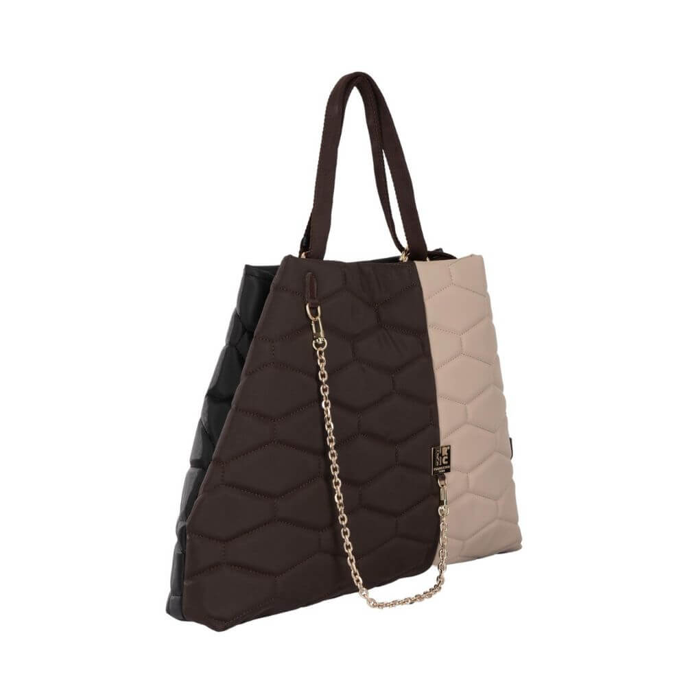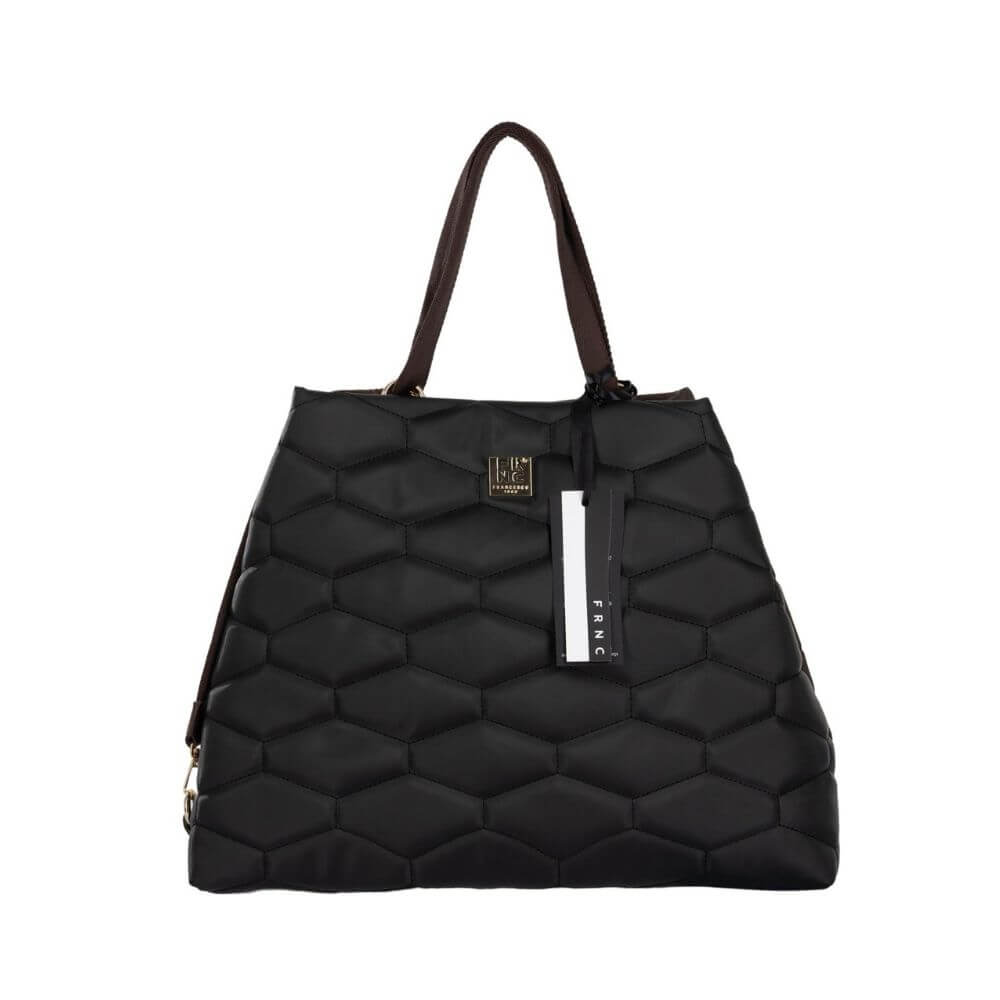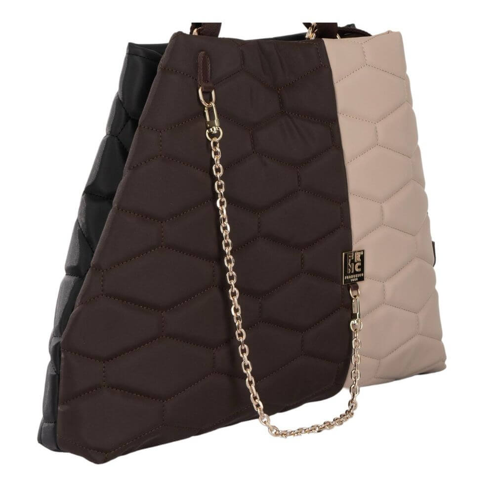 Γυναικεία τσάντα shopping ώμου και χειρός μεγάλου μεγέθους FRNC με κωδικό 4935, σε εντυπωσιακό συνδυασμό μπεζ, καφέ και μαύρου χρώματος. Κατασκευασμένη από Eco pelle satin (αδιάβροχο υλικό) με ιδιαίτερο εξάγωνο μοτίβο, προσφέρει κομψότητα και πρακτικότητα για κάθε περίσταση. Διαθέτει ρυθμιζόμενα λουράκια-ιμάντες για άνετη εφαρμογή και κλείνει με μαγνητικό κούμπωμα. Στο μπροστινό μέρος υπάρχει διάτρητο logo FRNC και αποσπώμενη διακοσμητική αλυσίδα, ενώ τα μεταλλικά χρυσά εξαρτήματα, οι κρίκοι και οι γάντζοι προσδίδουν μια διακριτική αίσθηση πολυτέλειας. Η τσάντα μπορεί να κρατηθεί και από τις δύο όψεις, καθώς διαθέτει διάτρητο logo FRNC και στο πίσω μέρος. Εσωτερικά περιλαμβάνει χώρισμα στη μέση που λειτουργεί και ως τσέπη με φερμουάρ, μία επιπλέον τσέπη που κλείνει με φερμουάρ και μία θήκη για κινητό, προσφέροντας άριστη οργάνωση. Οι διαστάσεις της είναι Μ:44 cm x Π:12 cm x Υ:34 cm. Ιδιαίτερο σχέδιο με σπαστές γωνίες στο επάνω μέρος. 100% HAND MADE IN GREECE. Όλα τα προϊόντα FRNC συνοδεύονται από υφασμάτινη θήκη αποθήκευσης.