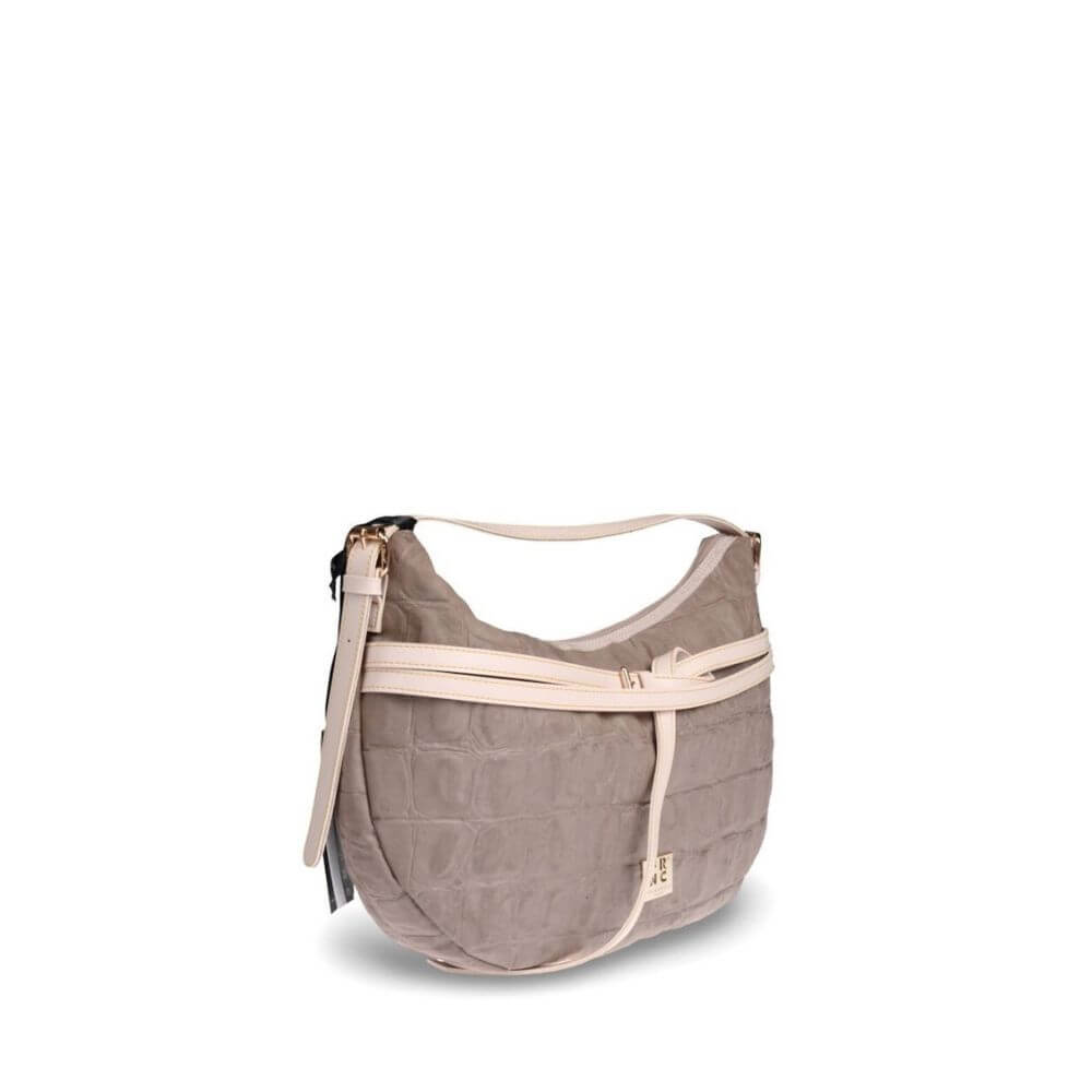 Κατασκευασμένη εξωτερικά από eco nubuck υψηλής ποιότητας, η τσάντα ξεχωρίζει για την ανθεκτικότητα και την ιδιαίτερη ανάγλυφη υφή της, ενώ το εσωτερικό της είναι επενδεδυμένο με ύφασμα για μεγαλύτερη προστασία των προσωπικών αντικειμένων. Το κεντρικό διαμέρισμα είναι ευρύχωρο και περιλαμβάνει δύο εσωτερικές θήκες που κλείνουν με φερμουάρ, βοηθώντας στην καλύτερη οργάνωση των αντικειμένων όπως πορτοφόλι, κινητό και καθημερινά αξεσουάρ.