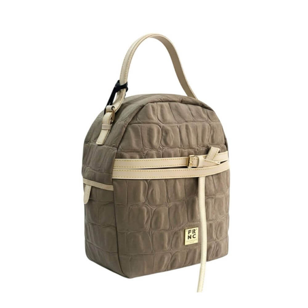Η τσάντα είναι κατασκευασμένη από eco nubuck υλικό με croco υφή που προσφέρει ιδιαίτερη αισθητική και ανθεκτικότητα στη χρήση. Διαθέτει μεταλλικό λογότυπο FRNC στο μπροστινό μέρος, ενώ το εσωτερικό της είναι επενδεδυμένο με ύφασμα υψηλής ποιότητας.