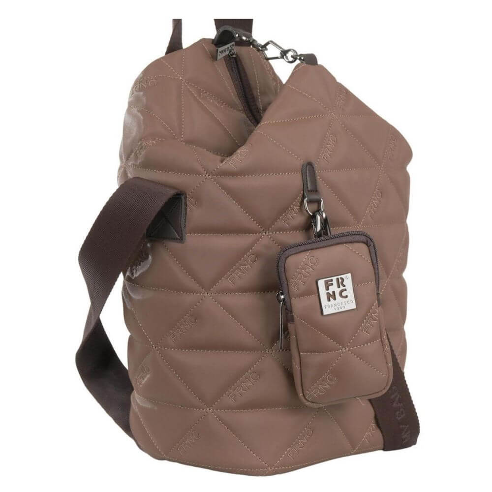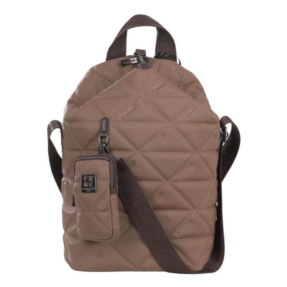 Γυναικεία τσάντα-σακίδιο πλάτης FRNC με κωδικό 4141W, μεγάλου μεγέθους, σε κομψό χρώμα πούρο. Κατασκευασμένη από Eco pelle satin, ένα αδιάβροχο υλικό με μοντέρνο μοτίβο τριγώνου, που συνδυάζει ανθεκτικότητα και στυλ. Το εσωτερικό της είναι επενδεδυμένο με ύφασμα υψηλής ποιότητας, προσφέροντας προσεγμένη αισθητική και πρακτικότητα.