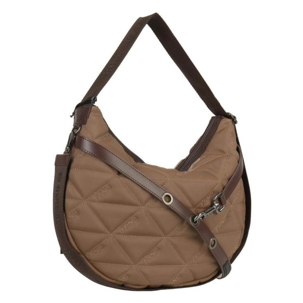 Γυναικεία τσάντα ώμου FRNC με κωδικό 4151 σε πούρο χρώμα, μεγάλου μεγέθους. Κατασκευασμένη από Eco pelle satin (αδιάβροχο υλικό) σε ανάγλυφο τρίγωνο μοτίβο και εσωτερικό φοδραρισμένο με ύφασμα υψηλής ποιότητας. Διαθέτει μακρύ ρυθμιζόμενο λουράκι-ιμάντα για χρήση στον ώμο ή και χιαστί. Το κλείσιμό της γίνεται με φερμουάρ, ενώ στην μπροστινή όψη ξεχωρίζουν τα διακοσμητικά ζωνάκια που συγκρατούνται με μεταλλικό γάντζο και το διακριτικό logo FRNC.