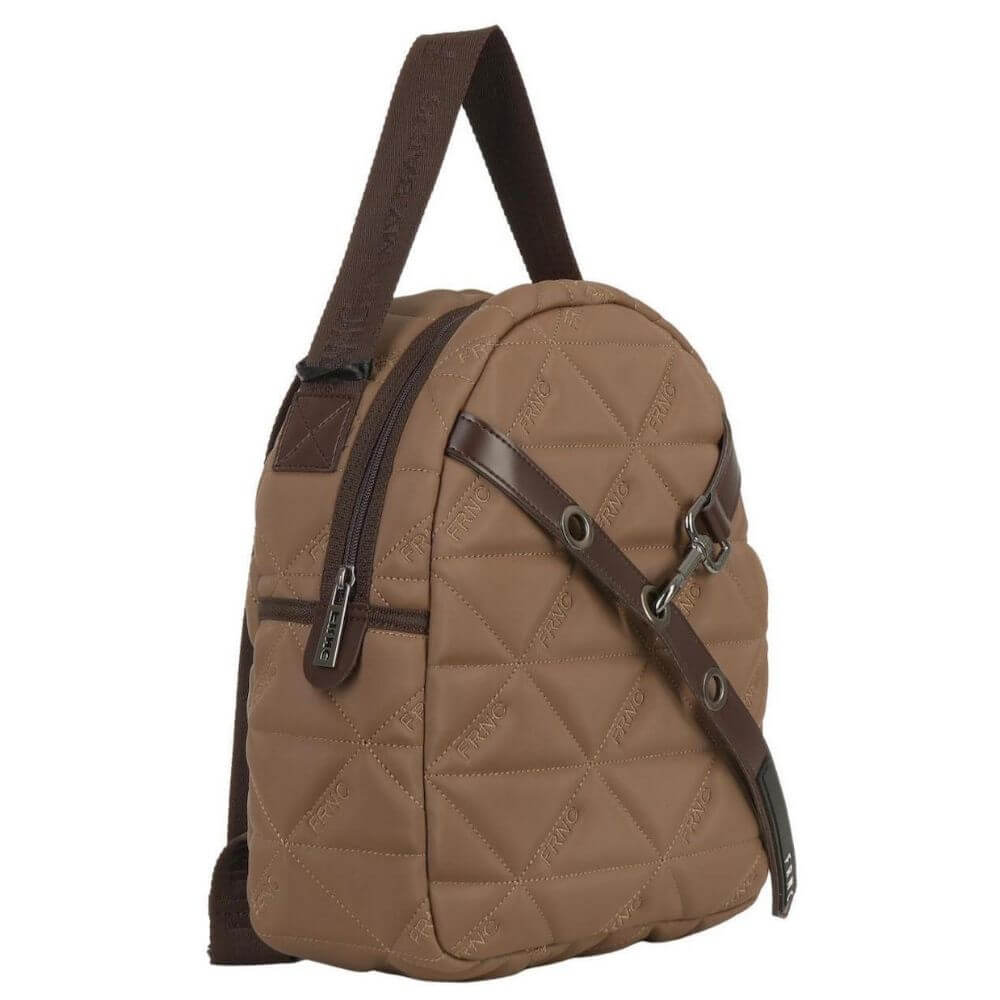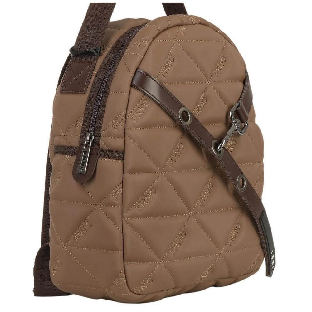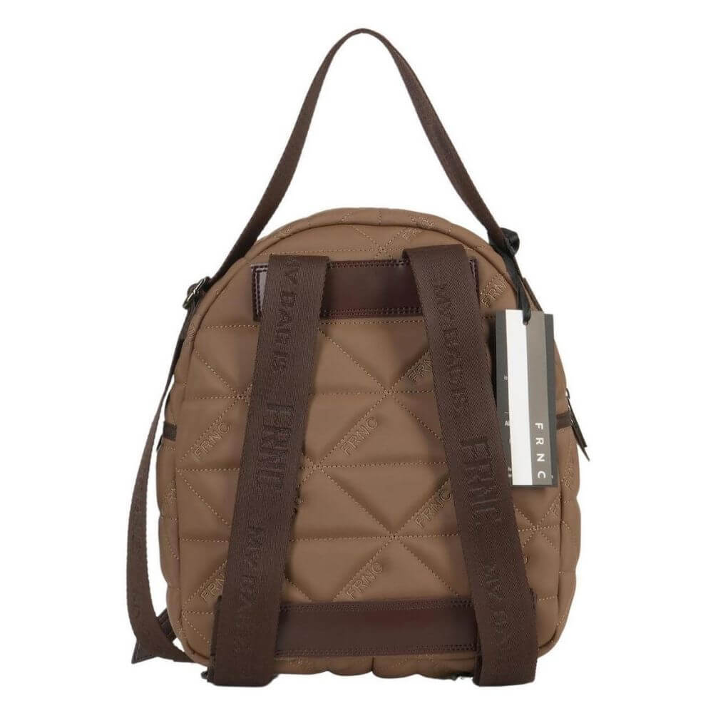 Γυναικεία τσάντα-σακίδιο πλάτης FRNC με κωδικό 4152, μεσαίου μεγέθους, σε κομψό χρώμα πούρο. Κατασκευασμένη από Eco pelle satin, ένα αδιάβροχο υλικό με ανάγλυφο μοτίβο τριγώνου, που συνδυάζει πολυτελή υφή και ανθεκτικότητα. Το εσωτερικό της είναι επενδεδυμένο με ύφασμα υψηλής ποιότητας, προσφέροντας άνεση και προσεγμένη αισθητική.