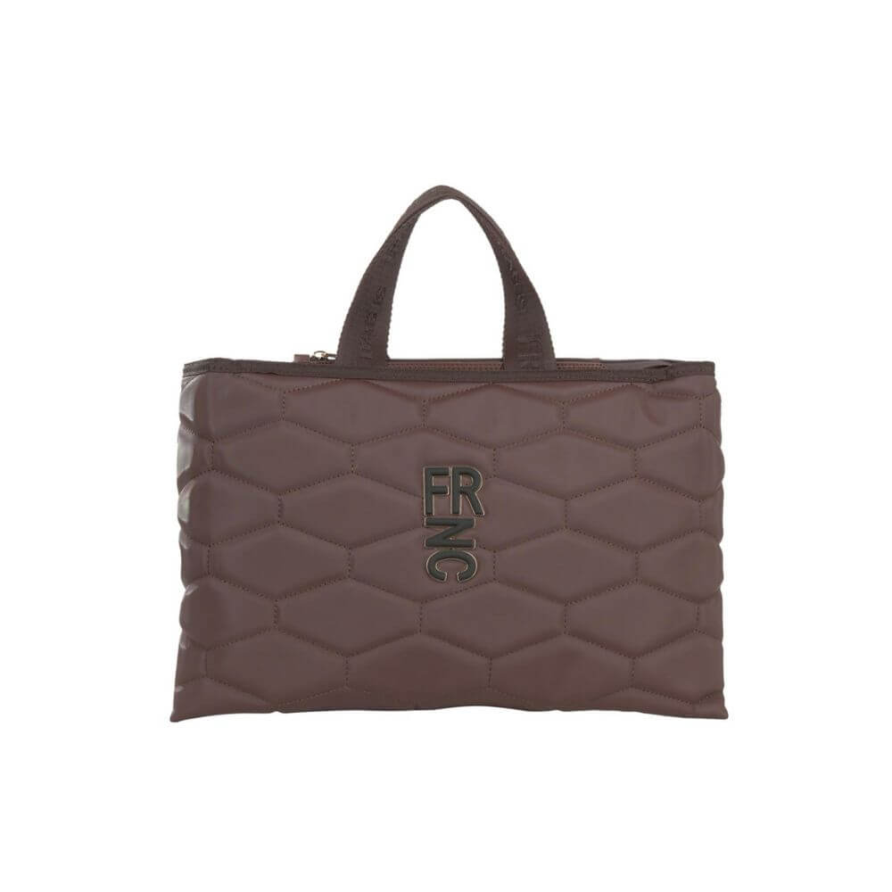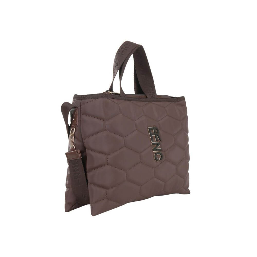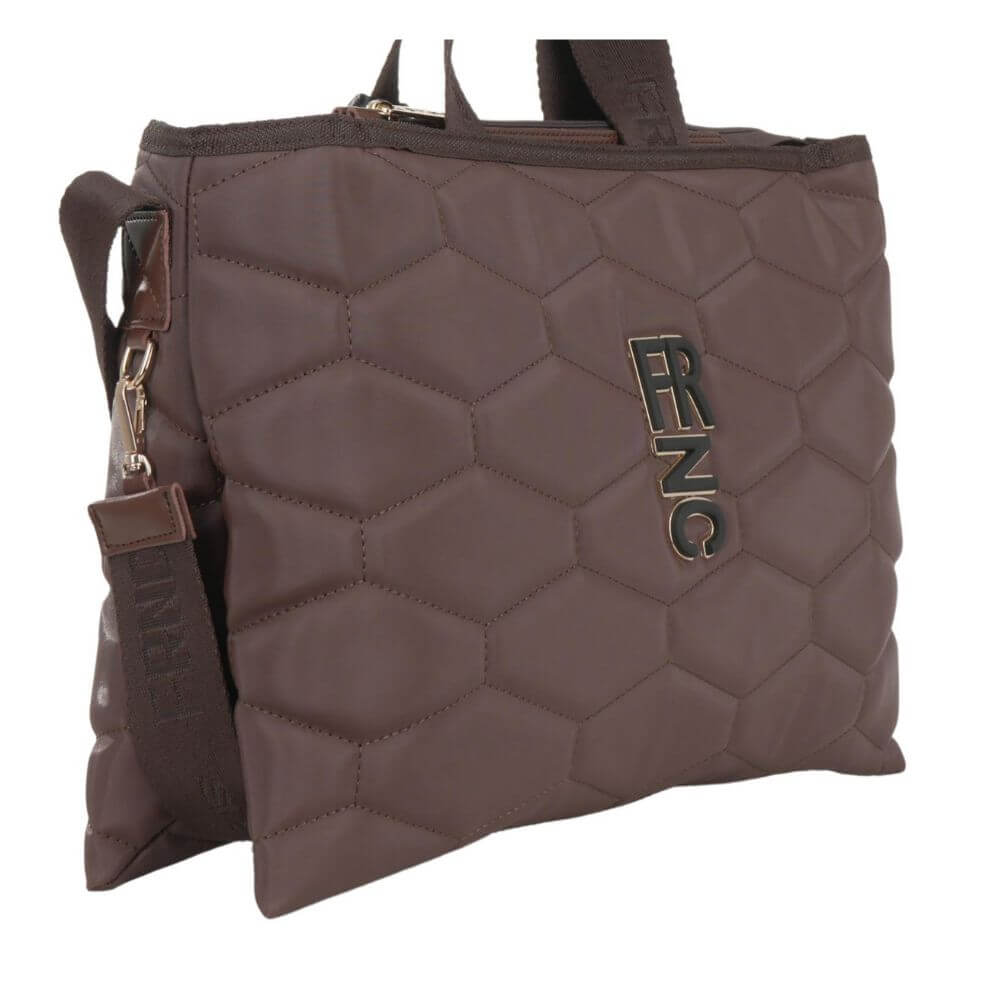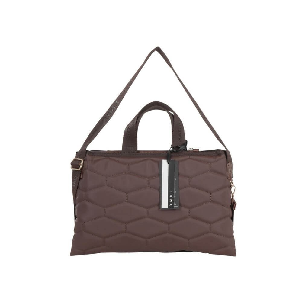 Γυναικεία τσάντα ώμου, χιαστί και χειρός FRNC 4939W σε καφέ χρώμα .Είναι μια κομψή και πρακτική επιλογή για κάθε στιγμή της ημέρας. Κατασκευασμένη από eco pelle satin, ένα αδιάβροχο υλικό με εξάγωνο μοτίβο, συνδυάζει ανθεκτικότητα και διαχρονικό στυλ. Διαθέτει άνετη χειρολαβή και μακρύ ρυθμιζόμενο ιμάντα, επιτρέποντας να φοριέται και χιαστί. Κλείνει με φερμουάρ και στο μπροστινό μέρος φέρει τα μεταλλικά γράμματα FRNC, που προσδίδουν μοντέρνο χαρακτήρα στη minimal αισθητική της.