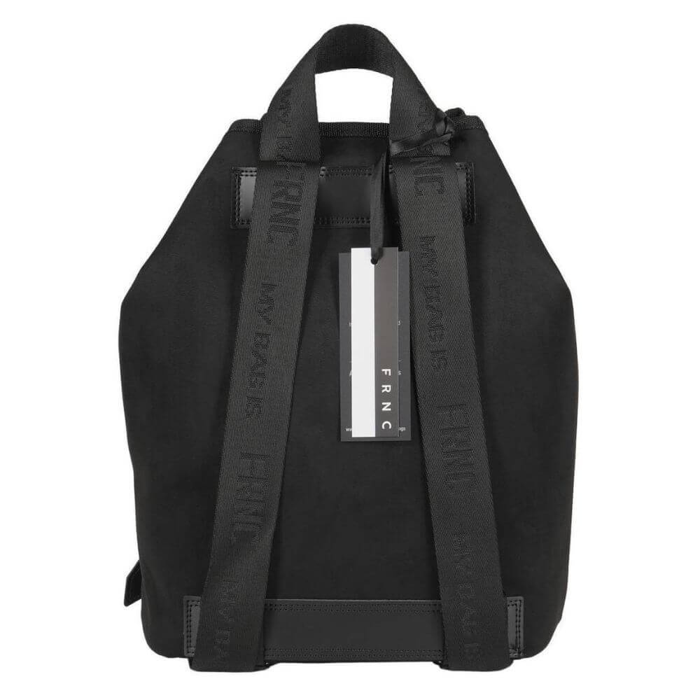 Διαθέτει ρυθμιζόμενους ιμάντες για άνετη εφαρμογή στην πλάτη και κλείνει με μαγνητικό κουμπί εξωτερικά και κλιπ εσωτερικά για επιπλέον ασφάλεια. Μπροστά ξεχωρίζουν τα διακοσμητικά ζωνάκια που ενώνονται με μεταλλικό γάντζο και το διάτρητο μεταλλικό logo FRNC. Εσωτερικά περιλαμβάνει ενιαίο χώρο, μία τσέπη που κλείνει με φερμουάρ και μία θήκη για κινητό. Οι διαστάσεις του σακιδίου είναι Μ:31 cm x Π:21,5 cm x Υ:36 cm. Συνοδεύεται από υφασμάτινη θήκη αποθήκευσης FRNC.