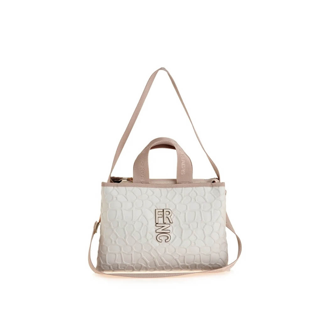 Το εσωτερικό της είναι φοδραρισμένο με ύφασμα υψηλής ποιότητας και προσφέρει εξαιρετική οργάνωση, καθώς διαθέτει κεντρικό χώρισμα που λειτουργεί και ως θήκη με φερμουάρ, μία επιπλέον τσέπη με φερμουάρ στη μία πλευρά και μία αντίστοιχη στην άλλη. Κλείνει με φερμουάρ για ασφάλεια, ενώ τα μπεζ-χρυσά μεταλλικά γράμματα FRNC στο μπροστινό μέρος ολοκληρώνουν κομψά το σχέδιο.