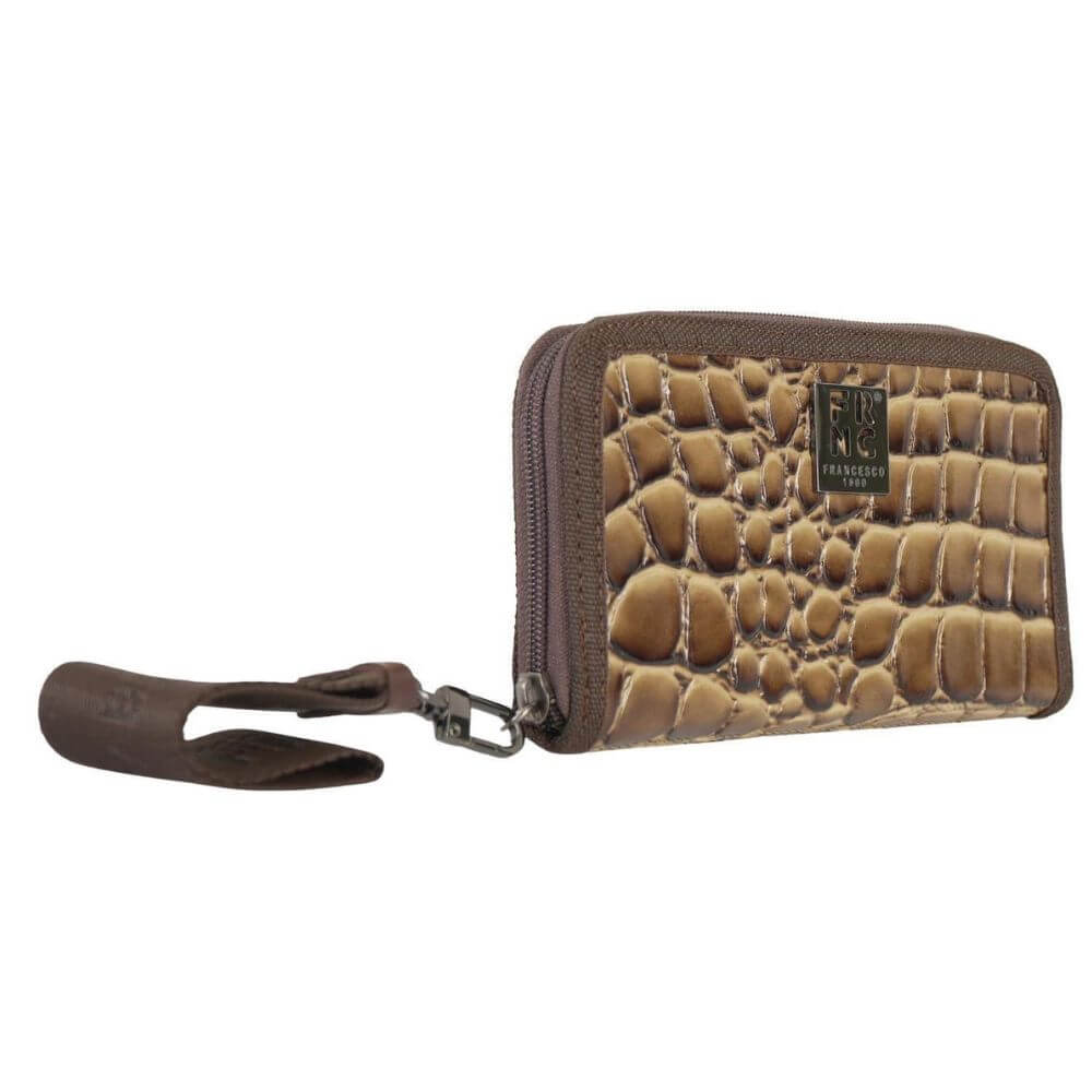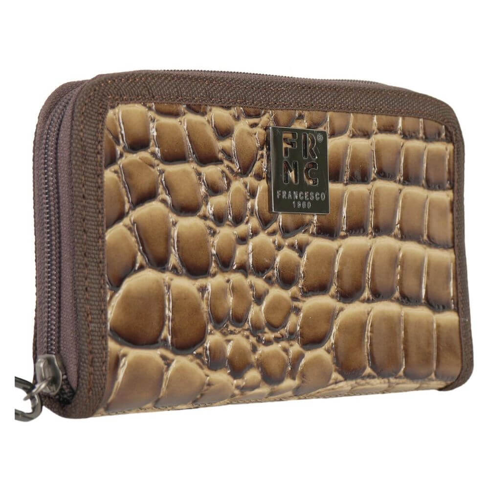 Γυναικείο πορτοφόλι FRNC με κωδικό W-5926, φτιαγμένο από Eco pelle με croco υφή που του χαρίζει ζεστό χαρακτήρα και ιδιαίτερο στυλ. Το μπροστινό μέρος διακοσμείται με το διάτρητο μεταλλικό λογότυπο FRNC.