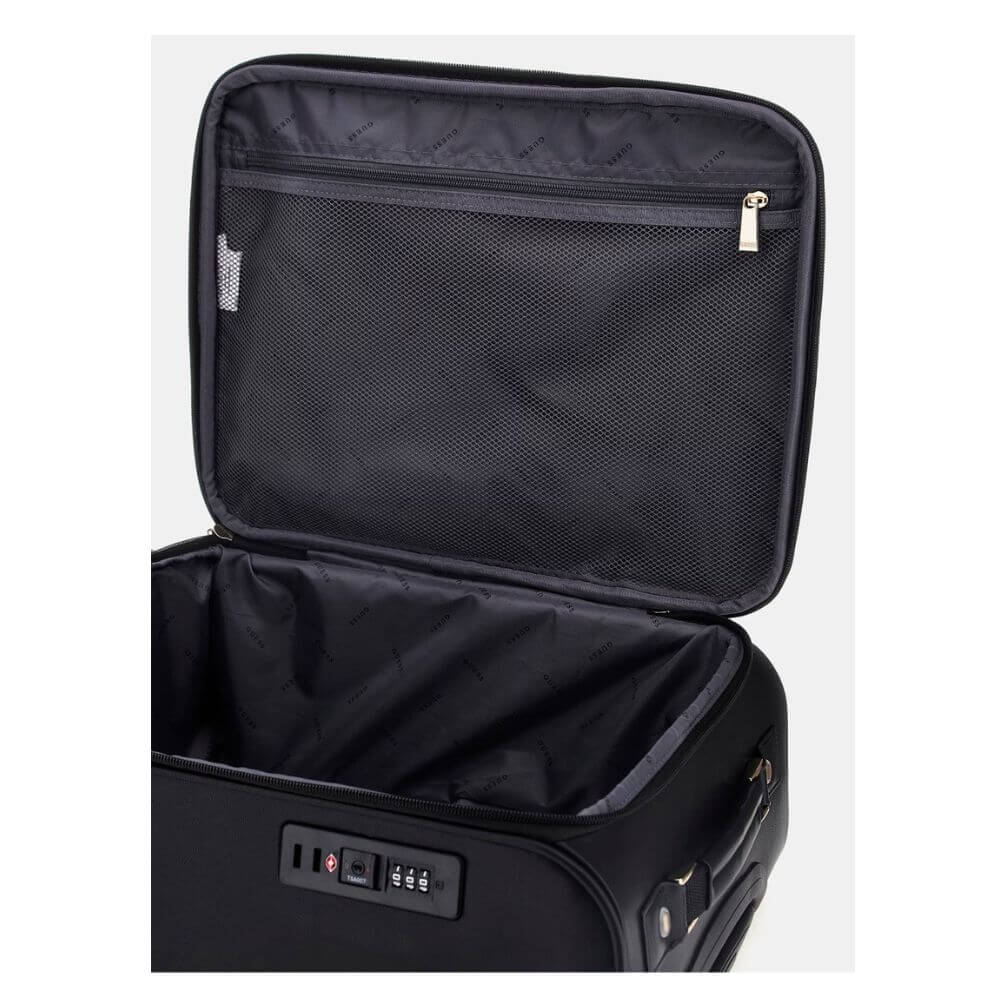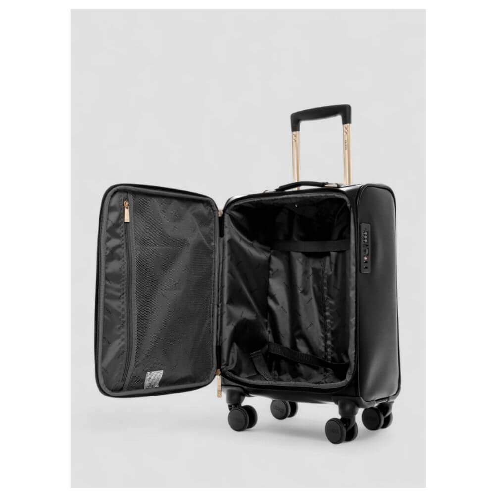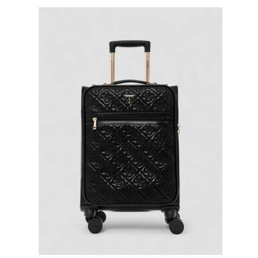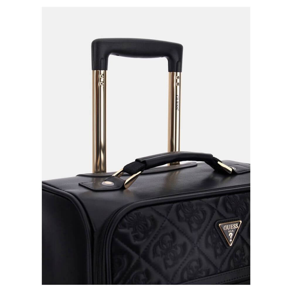 Γυναικεία τσάντα ταξιδιού Guess, κατασκευασμένη από συνθετικό υλικό με κλείσιμο φερμουάρ και λεπτομέρειες σε ανοιχτό χρυσαφί χρώμα. Διαθέτει ανάγλυφο λογότυπο 4G, εσωτερική επένδυση με το λογότυπο Guess, μπροστινή τσέπη και επιπλέον εσωτερικές τσέπες με φερμουάρ για καλύτερη οργάνωση. Στο μπροστινό μέρος υπάρχει μεταλλικό τρίγωνο με το χαρακτηριστικό λογότυπο της μάρκας, ενώ οι τέσσερις τροχοί ελεύθερης κύλισης προσφέρουν άνεση και ευκολία στη μετακίνηση. Η τσάντα έρχεται σε μαύρο χρώμα, είναι φτιαγμένη από 100% πολυουρεθάνη και έχει διαστάσεις 54 εκ. ύψος, 36 εκ. πλάτος και 23 εκ. βάθος. Μάρκα: Guess.