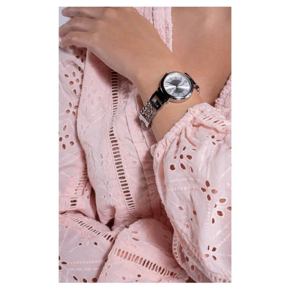 Το μπρασελέ από ανοξείδωτο ατσάλι σε ασημί απόχρωση ολοκληρώνει αρμονικά τον σχεδιασμό και εξασφαλίζει άνετη εφαρμογή, ενώ το κούμπωμα ασφαλείας προσφέρει σταθερότητα και ασφάλεια στη χρήση. Η αντοχή στο νερό 3 ATM το καθιστά κατάλληλο για τυχαία επαφή με το νερό.
