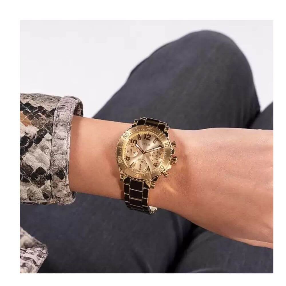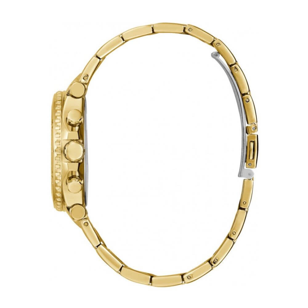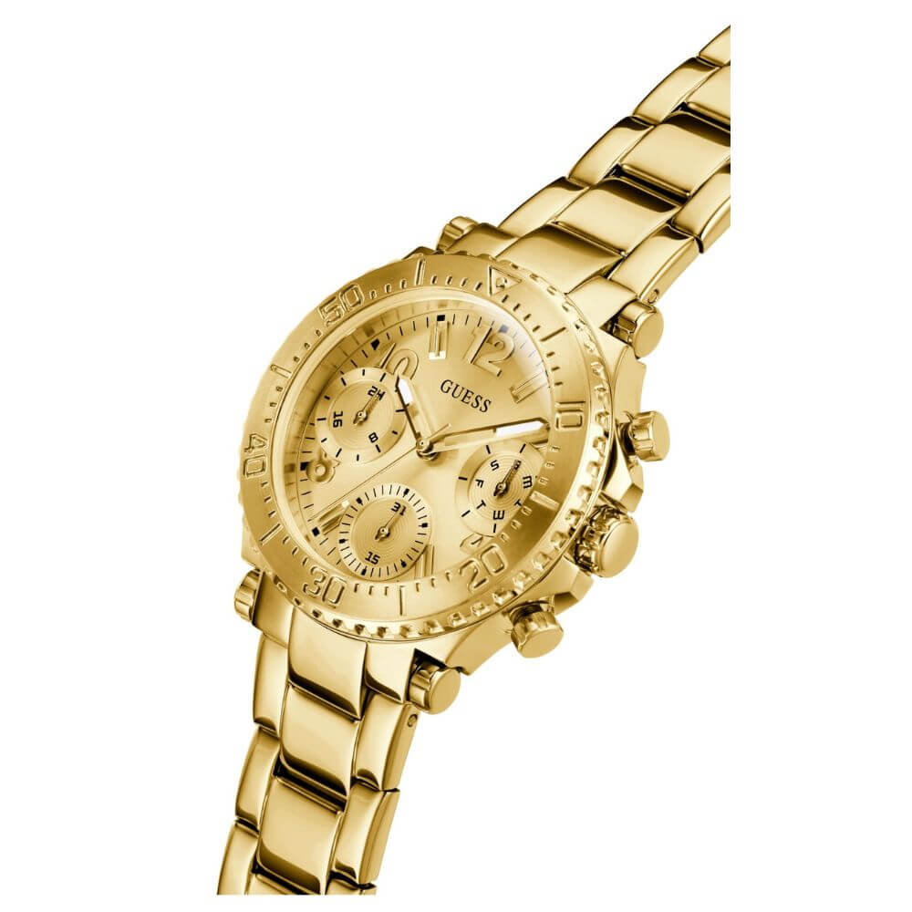 Γυναικείο ρολόι GUESS COSMIC GW0465L1 διαμέτρου 36mm, που συνδυάζει κομψότητα και λειτουργικότητα. Διαθέτει μηχανισμό Quartz Multi-Function ακριβείας και χρυσό καντράν με επίχρυσους δείκτες και κομψές λεπτομέρειες. Η κάσα είναι κατασκευασμένη από ανοξείδωτο ατσάλι με επίχρυση επίστρωση, ενώ το κρύσταλλο είναι από ορυκτό ειδικής σκλήρυνσης, προσφέροντας αντοχή στις φθορές. Το μπρασελέ είναι επίσης από ανοξείδωτο ατσάλι σε επίχρυση απόχρωση και ασφαλίζει με κούμπωμα ασφαλείας. Το ρολόι είναι αδιάβροχο έως 5 ΑΤΜ, καθιστώντας το ιδανικό για καθημερινή χρήση με διακριτική πολυτέλεια.