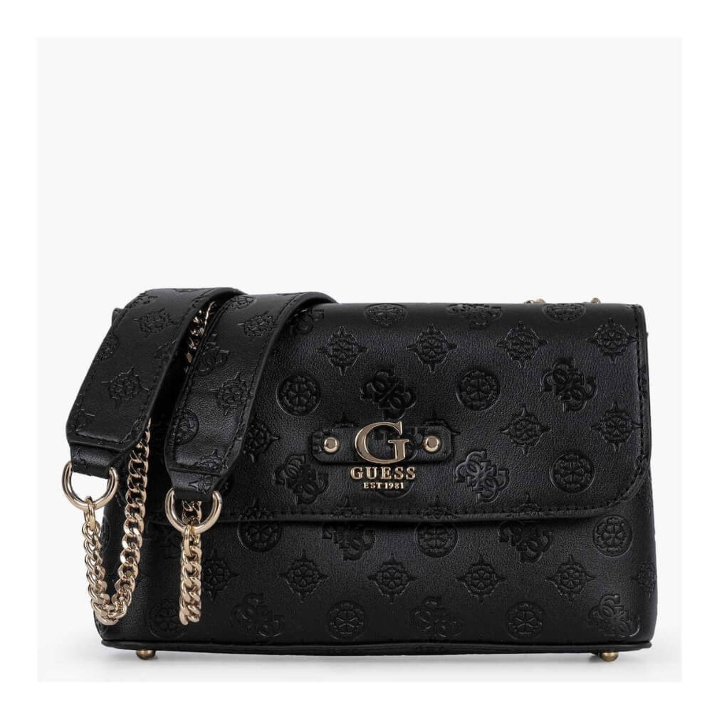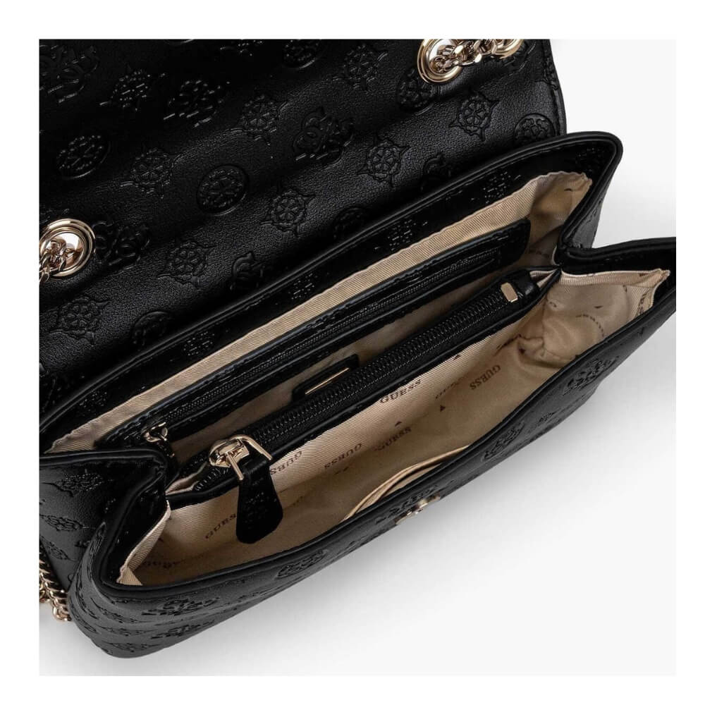 Γυναικεία τσάντα ώμου/χιαστί GUESS Dita HWPD7602210 σε μαύρη απόχρωση με logo pattern. Πρόκειται για ένα κομψό και μοντέρνο σχέδιο που συνδυάζει διαχρονική αισθητική με πρακτικότητα, ιδανικό για καθημερινή χρήση.