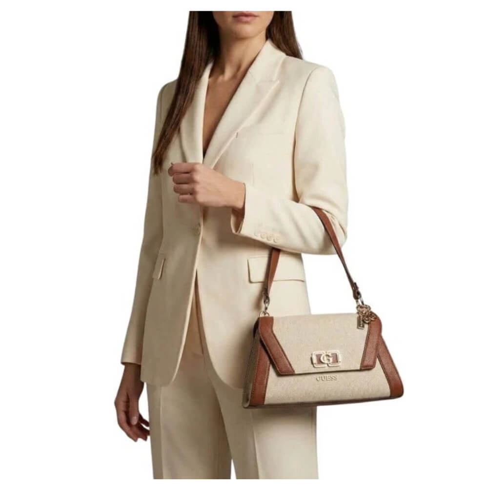 Γυναικεία τσάντα ώμου/χιαστί Guess Karnilla HWAG9719190 σε ταμπά (Natural Cognac). Είναι μια κομψή και ευέλικτη επιλογή που ταιριάζει εύκολα σε καθημερινά αλλά και πιο προσεγμένα looks.