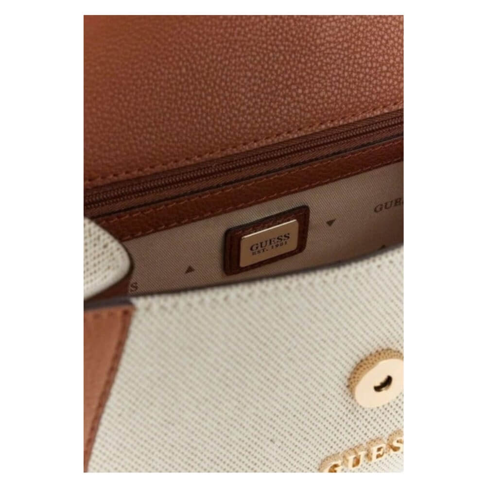 Είναι κατασκευασμένη από οικολογικό δέρμα (PU), συνδυάζοντας ανθεκτικότητα με μοντέρνα αισθητική. Ο δίχρωμος συνδυασμός natural και cognac αποχρώσεων, μαζί με το μεταλλικό λογότυπο Guess, δίνουν μια κομψή και διαχρονική εμφάνιση.