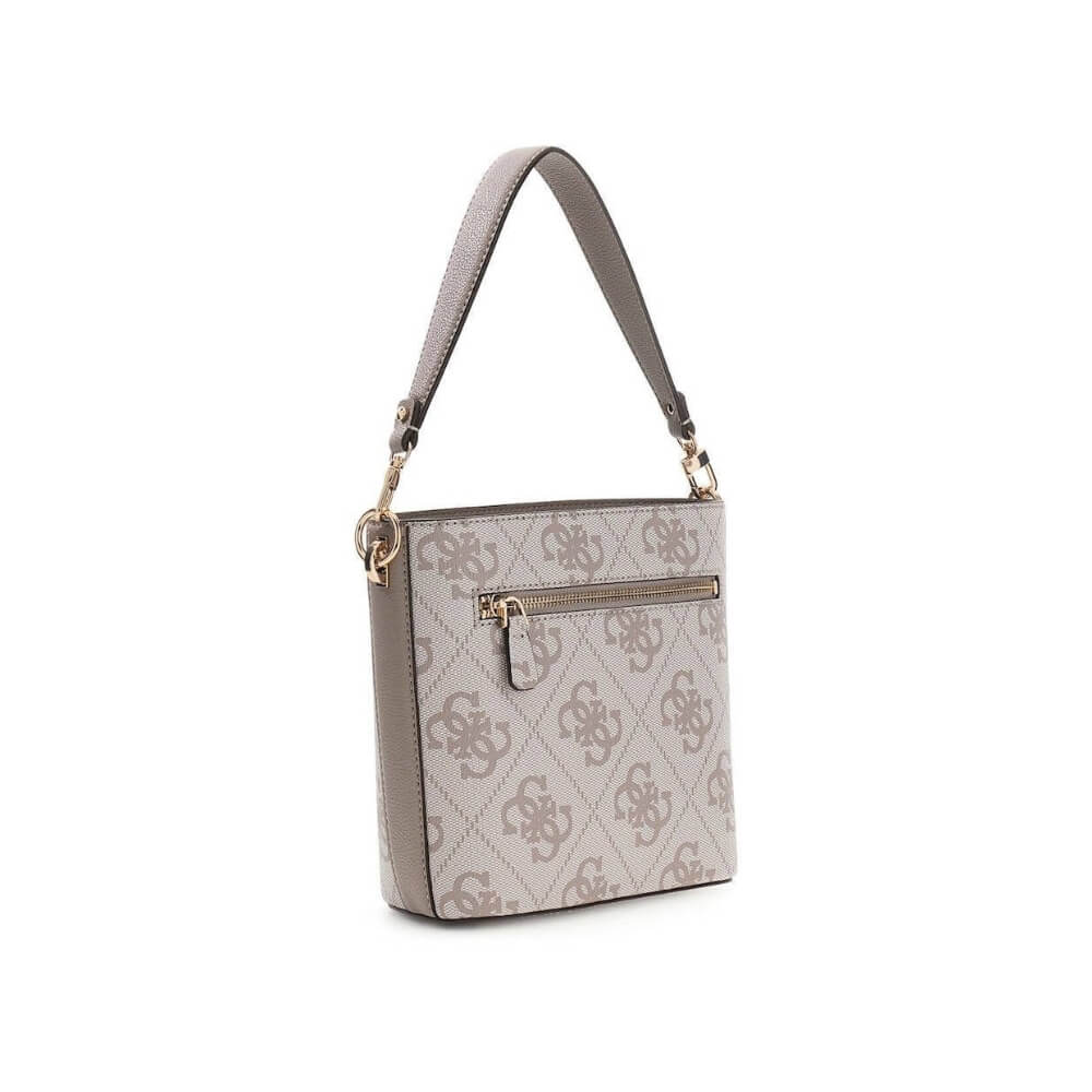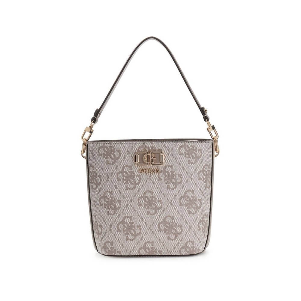 Γυναικεία τσάντα ώμου/χιαστί GUESS Karnilla HWOS9901010 Dark Taupe Logo σε γκρι-ανθρακί απόχρωση. Είναι μια κομψή επιλογή με ιδιαίτερο bucket σχεδιασμό που ξεχωρίζει για τη μοντέρνα αισθητική του.
