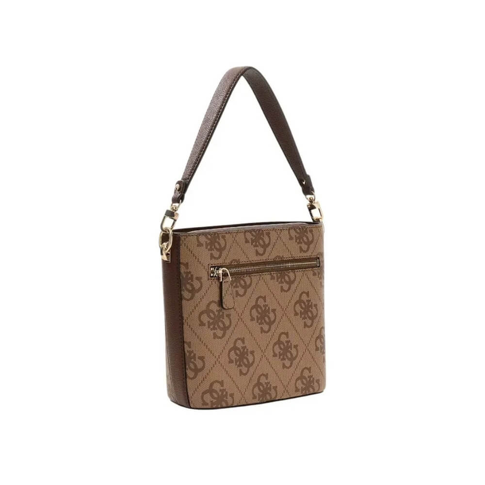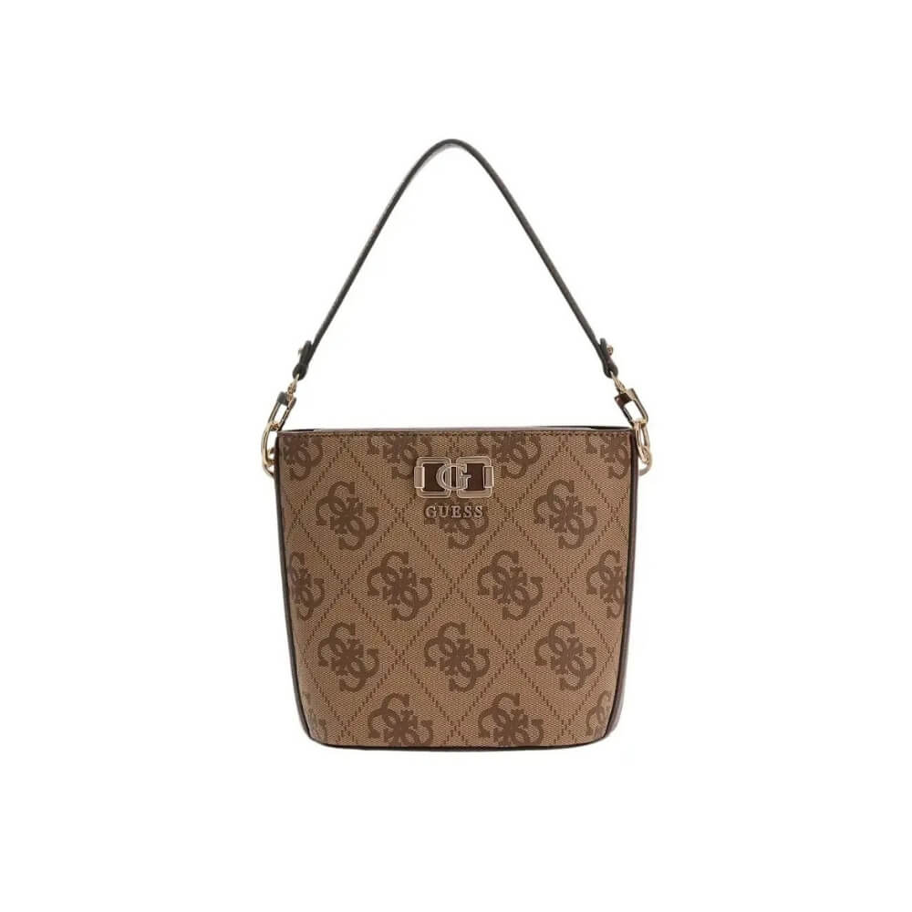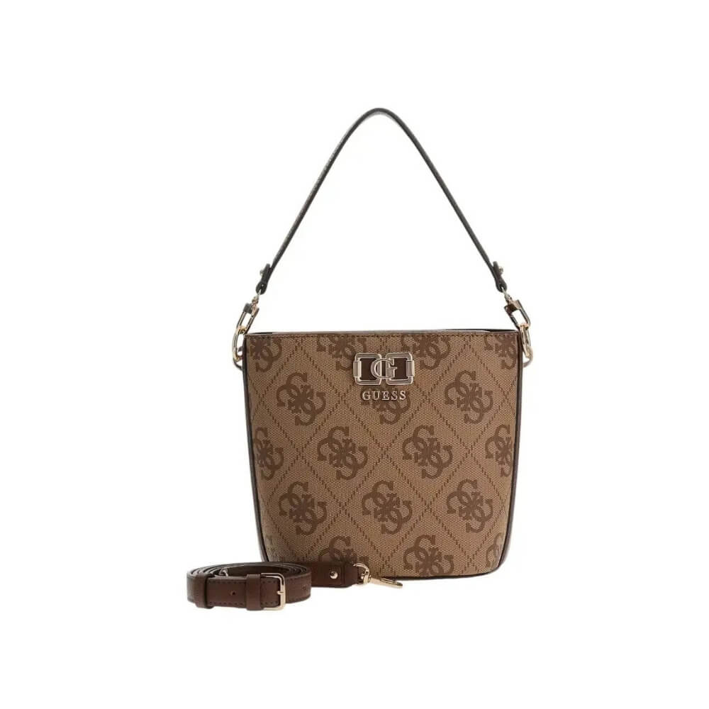 Γυναικεία τσάντα ώμου/χιαστί GUESS Karnilla HWOS9901010 Latte Logo σε μπεζ/καφέ απόχρωση. Είναι μια κομψή επιλογή με μοντέρνο bucket σχεδιασμό που συνδυάζει πρακτικότητα και στυλ.