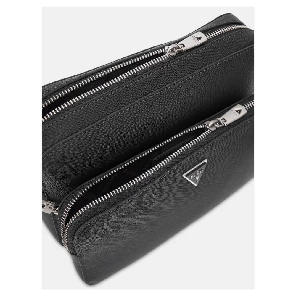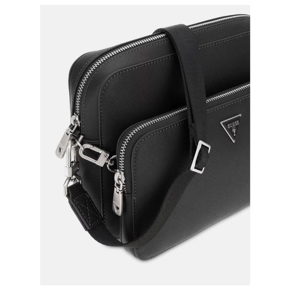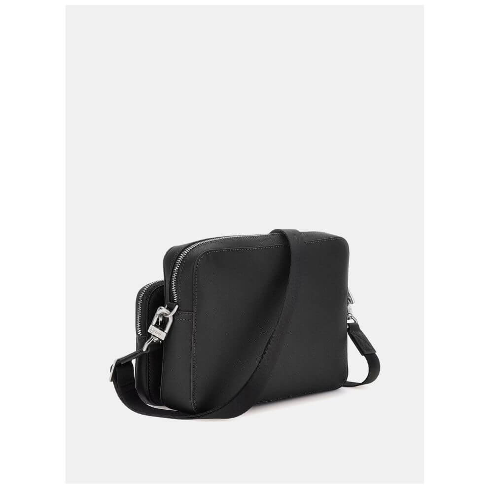Ανδρικό τσαντάκι crossbody Guess Milano HMMISAP5322-BLA σε μαύρο χρώμα, ιδανικό για μοντέρνες και πρακτικές εμφανίσεις. Είναι κατασκευασμένο από ποιοτική δερματίνη με επεξεργασία saffiano, προσφέροντας αντοχή και κομψή υφή. Διαθέτει κλείσιμο με φερμουάρ για ασφαλή αποθήκευση, μπροστινή τσέπη με φερμουάρ για άμεση πρόσβαση στα απαραίτητα και μεταλλικά στοιχεία σε ασημί χρώμα που αναδεικνύουν τον premium χαρακτήρα του. Το τριγωνικό μεταλλικό λογότυπο Guess στο μπροστινό μέρος προσθέτει διακριτική ταυτότητα, ενώ ο σχεδιασμός του το καθιστά ιδανικό για καθημερινή χρήση, μετακινήσεις και βόλτες, συνδυάζοντας στυλ και λειτουργικότητα.