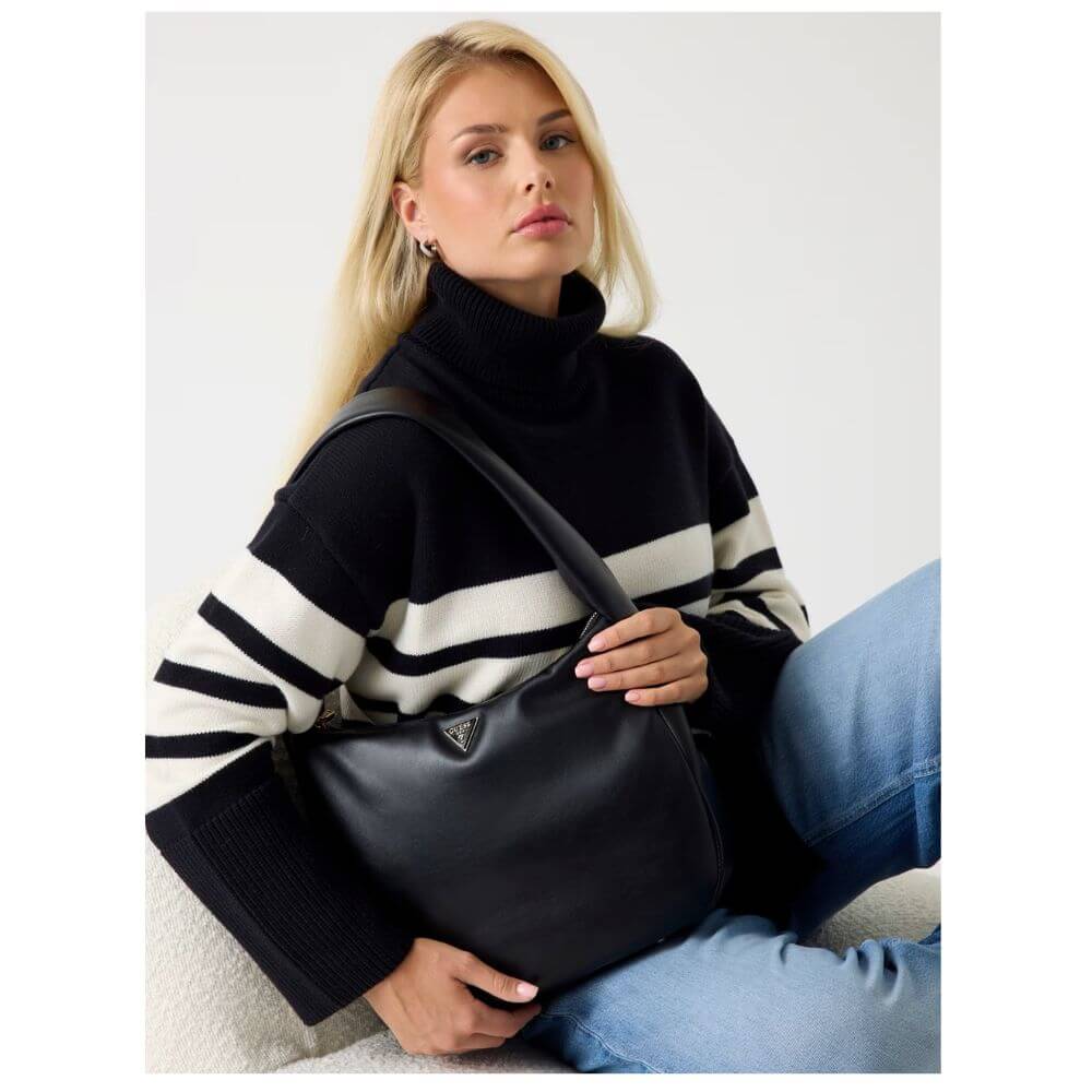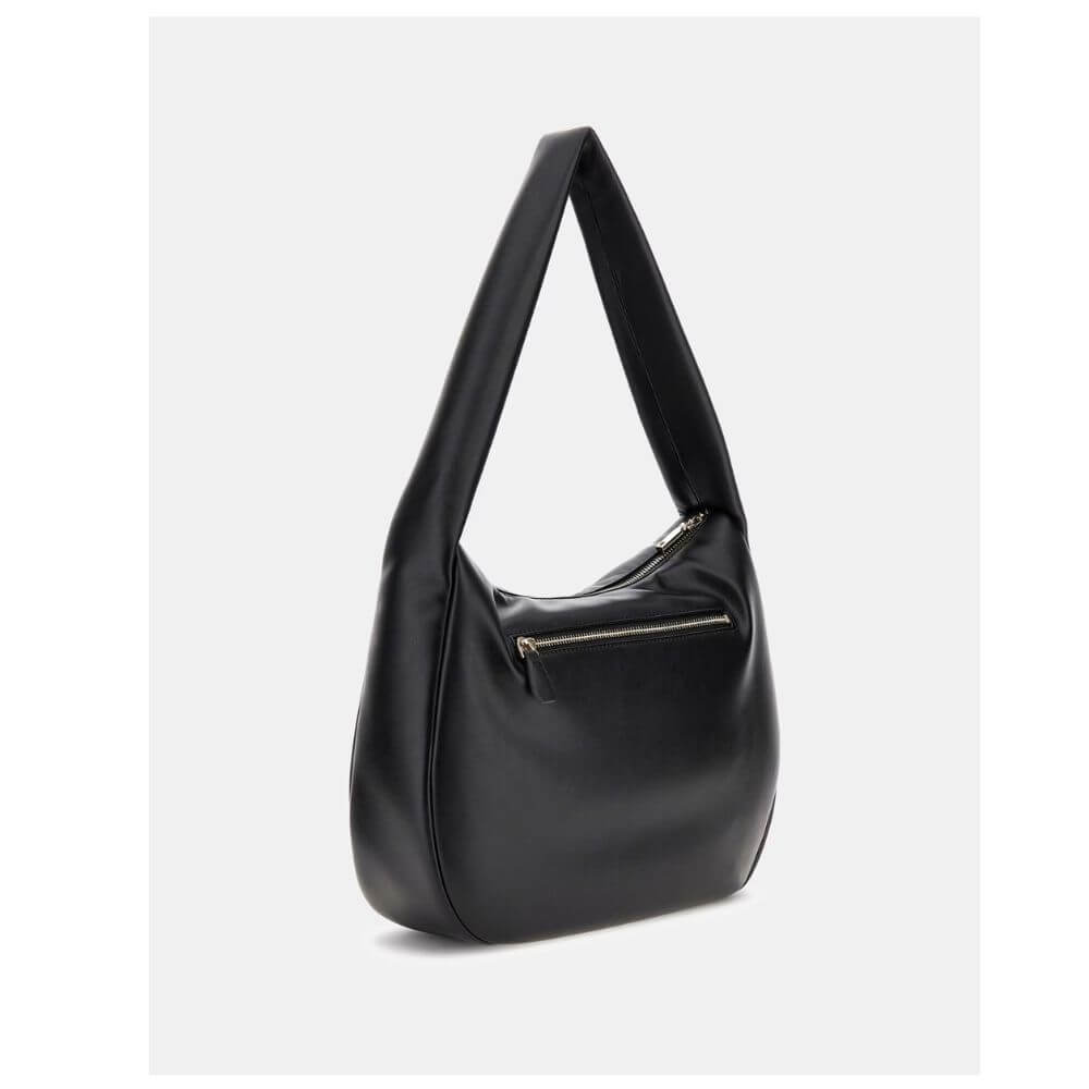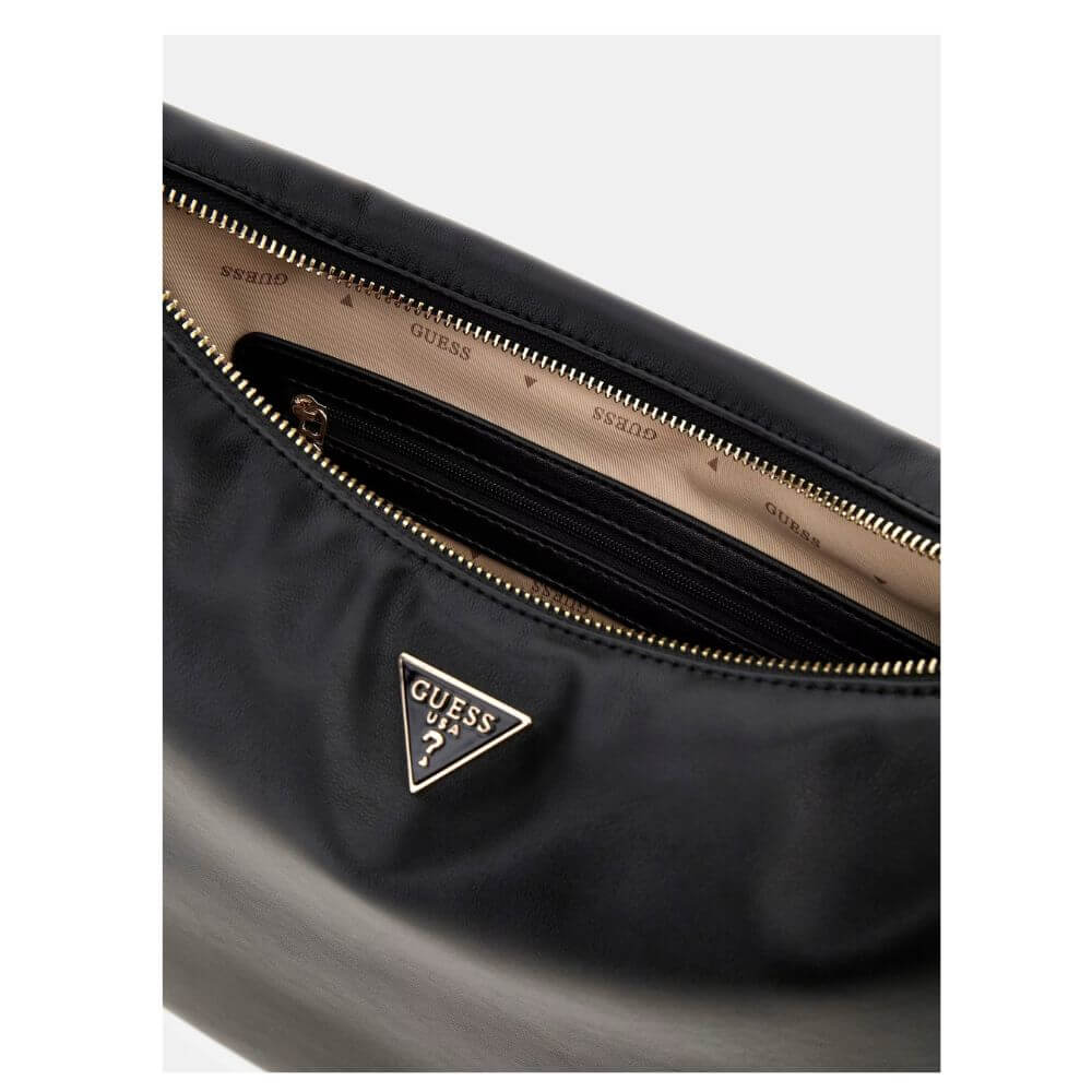 Γυναικεία τσάντα ώμου τύπου hobo Guess Sunetra HWNG7534020 σε μαύρο χρώμα, με λεία και μαλακή υφή που προσφέρει άνεση και διαχρονική κομψότητα. Κλείνει με φερμουάρ για ασφάλεια, ενώ στο πίσω μέρος διαθέτει πρακτική εξωτερική τσέπη για εύκολη πρόσβαση στα μικροαντικείμενα που χρειάζεστε συχνά. Μια στιλάτη και λειτουργική επιλογή για καθημερινή χρήση.