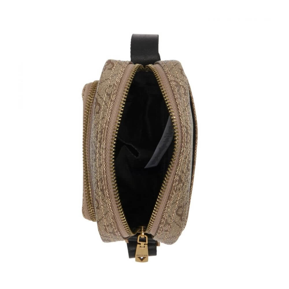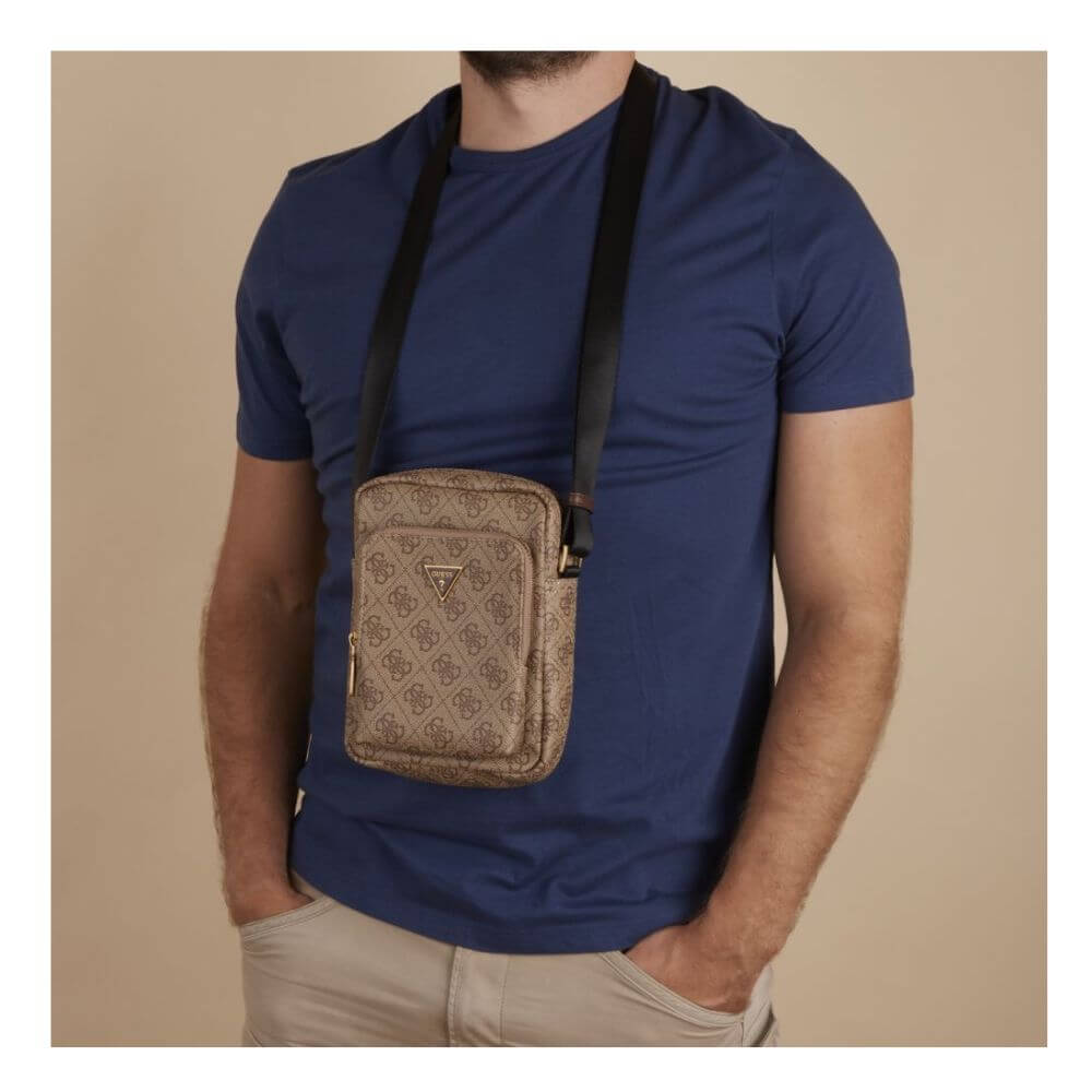 Ανδρική crossbody τσάντα GUESS HMEVZLP3163-BBO σε μπεζ χρώμα, με διακριτικό all over logo print που προσδίδει κομψό και σύγχρονο χαρακτήρα. Είναι κατασκευασμένη από υδατοαπωθητικό eco leather από 100% polyurethane, προερχόμενο από ανακυκλωμένα υλικά, προσφέροντας αντοχή και οικολογική συνείδηση. Διαθέτει ένα κύριο διαμέρισμα κατάλληλο για συσκευή έως 6,8’’, καθώς και μπροστινή θήκη με φερμουάρ για ασφαλή αποθήκευση των απαραίτητων αντικειμένων. Συμπληρώνεται από μία ανοιχτή εξωτερική θήκη, ιδανική για gadget ή αντικείμενα άμεσης χρήσης. Ο ρυθμιζόμενος ιμάντας ώμου από νάιλον υψηλής πυκνότητας εξασφαλίζει άνετη εφαρμογή, ενώ το μεταλλικό λογότυπο Guess στο μπροστινό μέρος ολοκληρώνει το κομψό design. Με διαστάσεις 14 x 20 x 4 cm και ρυθμιζόμενο λουράκι μήκους περίπου 110–130 cm, αποτελεί ιδανική επιλογή για καθημερινές εμφανίσεις με στυλ και πρακτικότητα.