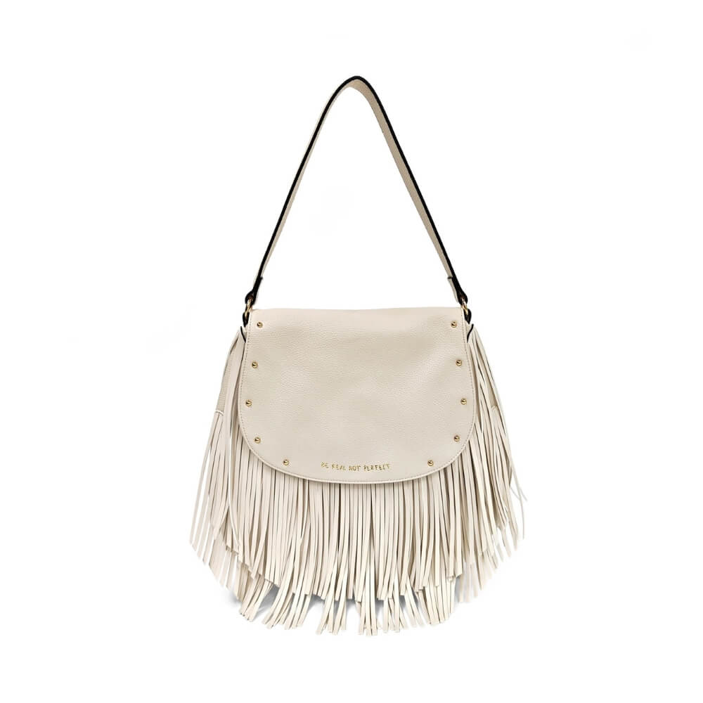 Γυναικεία τσάντα ώμου Le Pandorine Fringe Shoulder Bag σε κομψή μπεζ απόχρωση panna με χαρακτηριστικό μήνυμα “BE REAL NOT PERFECT” και κωδικό προϊόντος PS2610B02-C0R, ιδανική για καθημερινές εμφανίσεις με μοντέρνο και νεανικό χαρακτήρα. Δημιουργία της ιταλικής εταιρείας Le Pandorine, ξεχωρίζει για τον ιδιαίτερο σχεδιασμό της με flap και διακοσμητικές φούντες, συνδυάζοντας στυλ και πρακτικότητα.