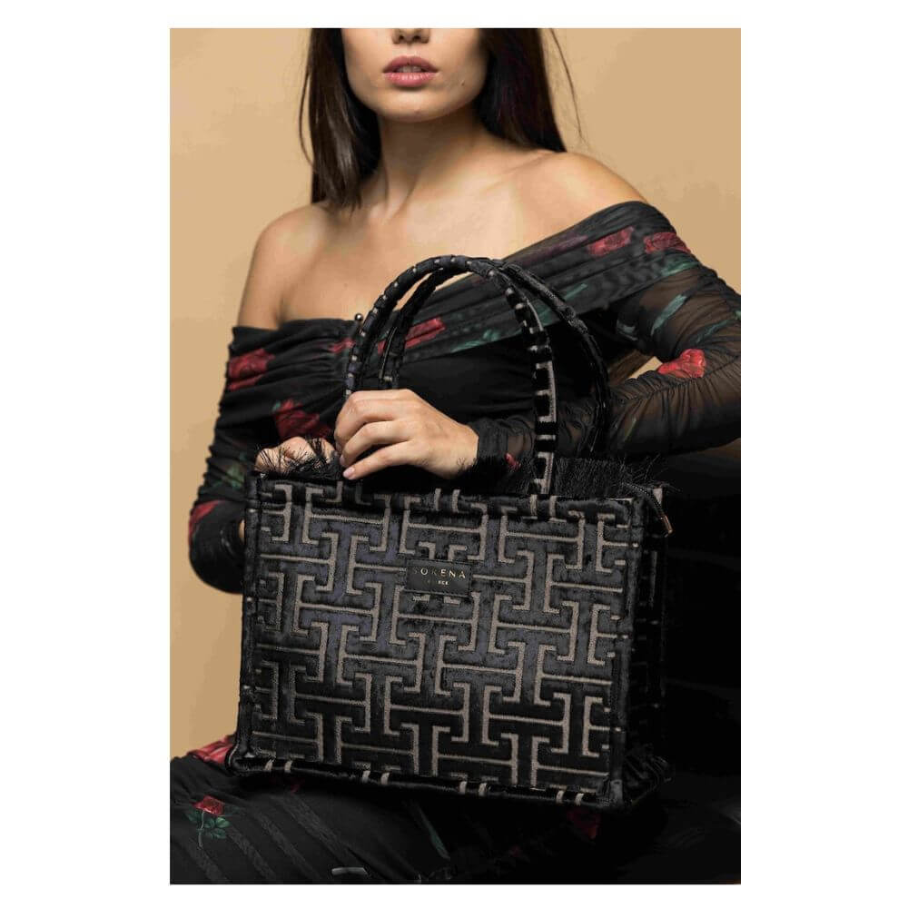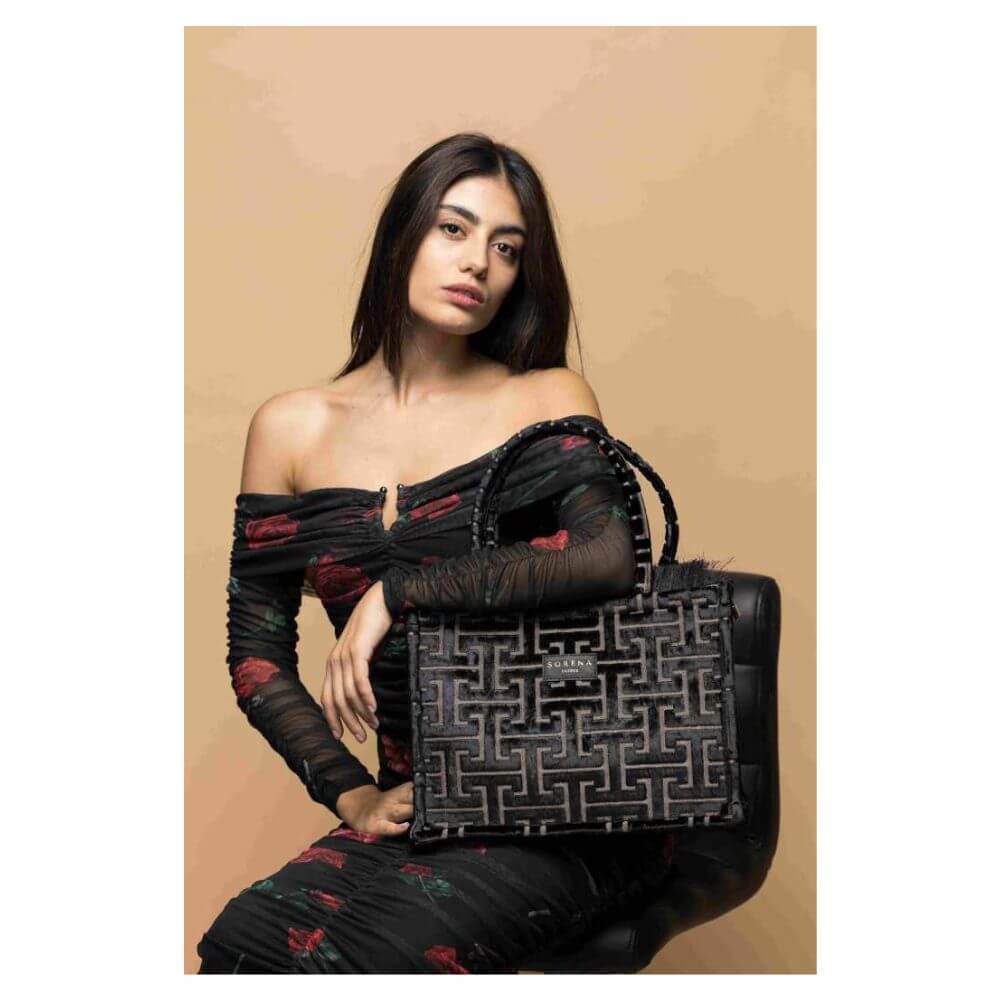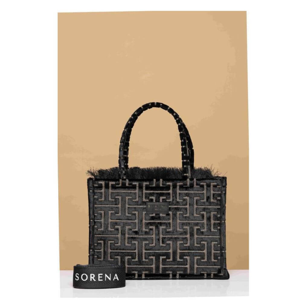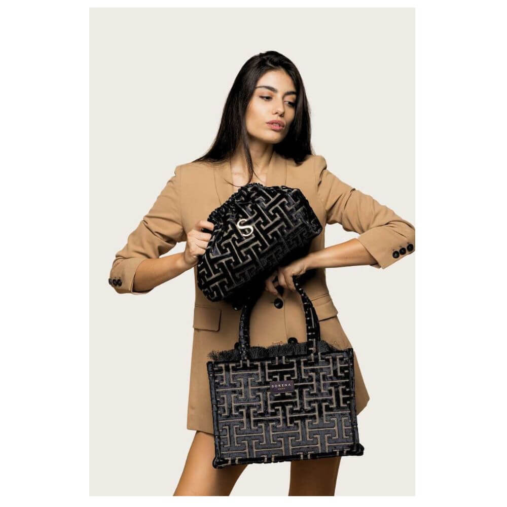Γυναικεία τσάντα χειρός Sorena Andro Medium Tote Bag, μια κομψή και σύγχρονη επιλογή μεσαίου μεγέθους, κατασκευασμένη από υψηλής ποιότητας ύφασμα με το χαρακτηριστικό σχέδιο της Sorena. Προσφέρει πρακτικότητα και διακριτική πολυτέλεια, ιδανική για καθημερινές αλλά και πιο ιδιαίτερες εμφανίσεις.