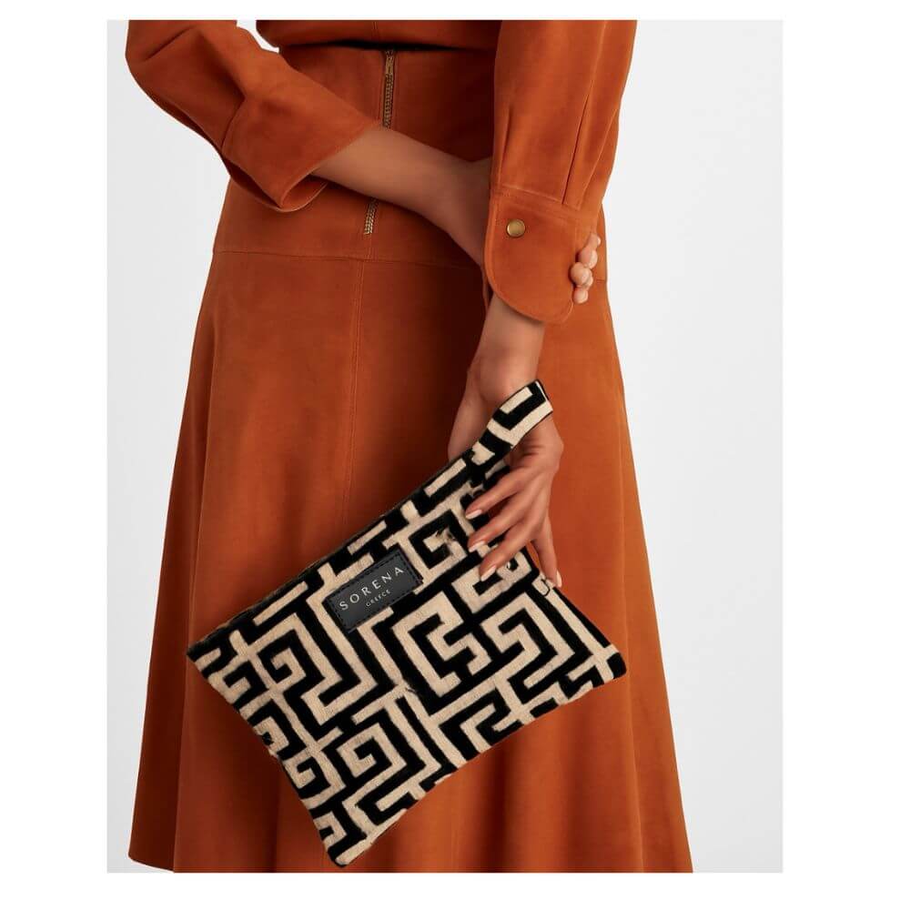 Γυναικεία τσάντα Sorena Domna Clutch σε μαύρο-μπεζ χρώμα .Συνδυάζει κομψότητα και πρακτικότητα, προσφέροντας ένα ξεχωριστό αξεσουάρ για κάθε περίσταση. Κατασκευασμένη χειροποίητα στην Ελλάδα από βελούδο εξαιρετικής ποιότητας, διαθέτει απαλή υφή και μοντέρνο σχεδιασμό που αποπνέει διακριτική πολυτέλεια.