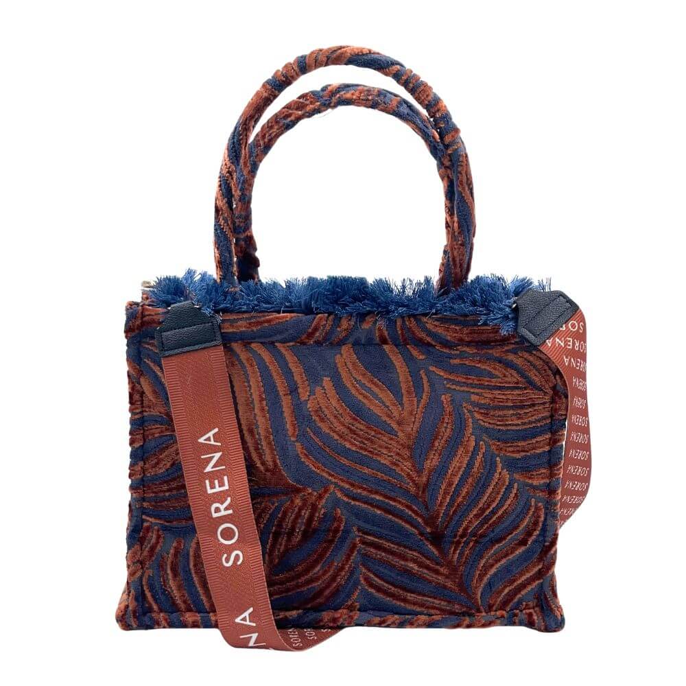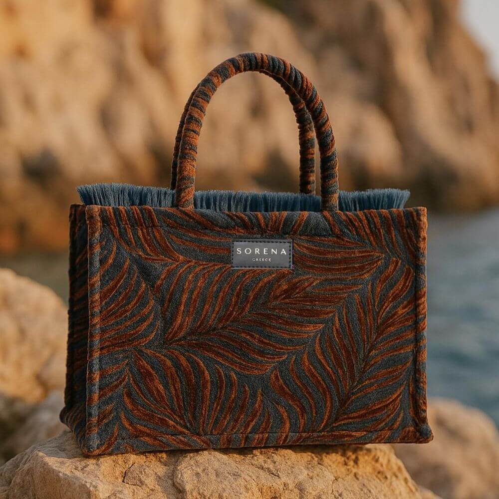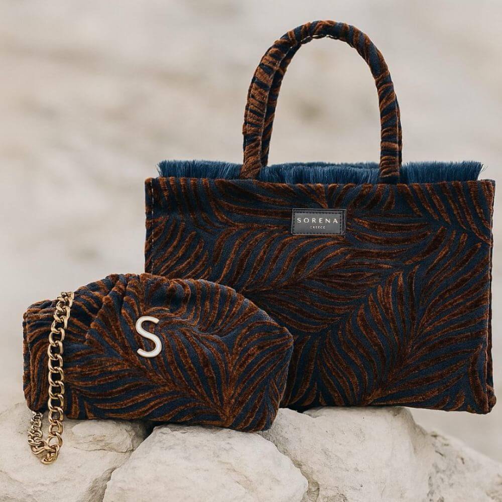 Γυναικεία τσάντα tote Sorena Handmade με κωδικό Dorothy Medium Tote Bag, σε κομψή καφέ απόχρωση με μπλε λεπτομέρειες. Κατασκευασμένη με βελούδινη υφή και προσεγμένο σχεδιασμό, προσφέρει ιδιαίτερο χαρακτήρα και μοναδικό στυλ σε κάθε εμφάνιση.