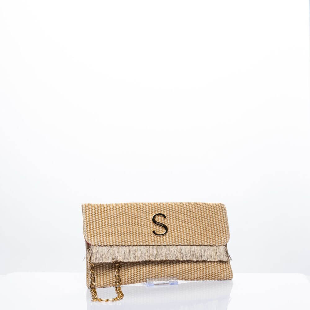 Γυναικεία τσάντα χειρός και χιαστί Harites Clutch Irida της SORENA. Αποτελεί μια κομψή και πολυτελή επιλογή για ιδιαίτερες εμφανίσεις. Το luxury ύφασμα από ψάθα χαρίζει φυσική αισθητική με εκλεπτυσμένο χαρακτήρα, ιδανικό για καλοκαιρινές εξόδους αλλά και πιο formal περιστάσεις.