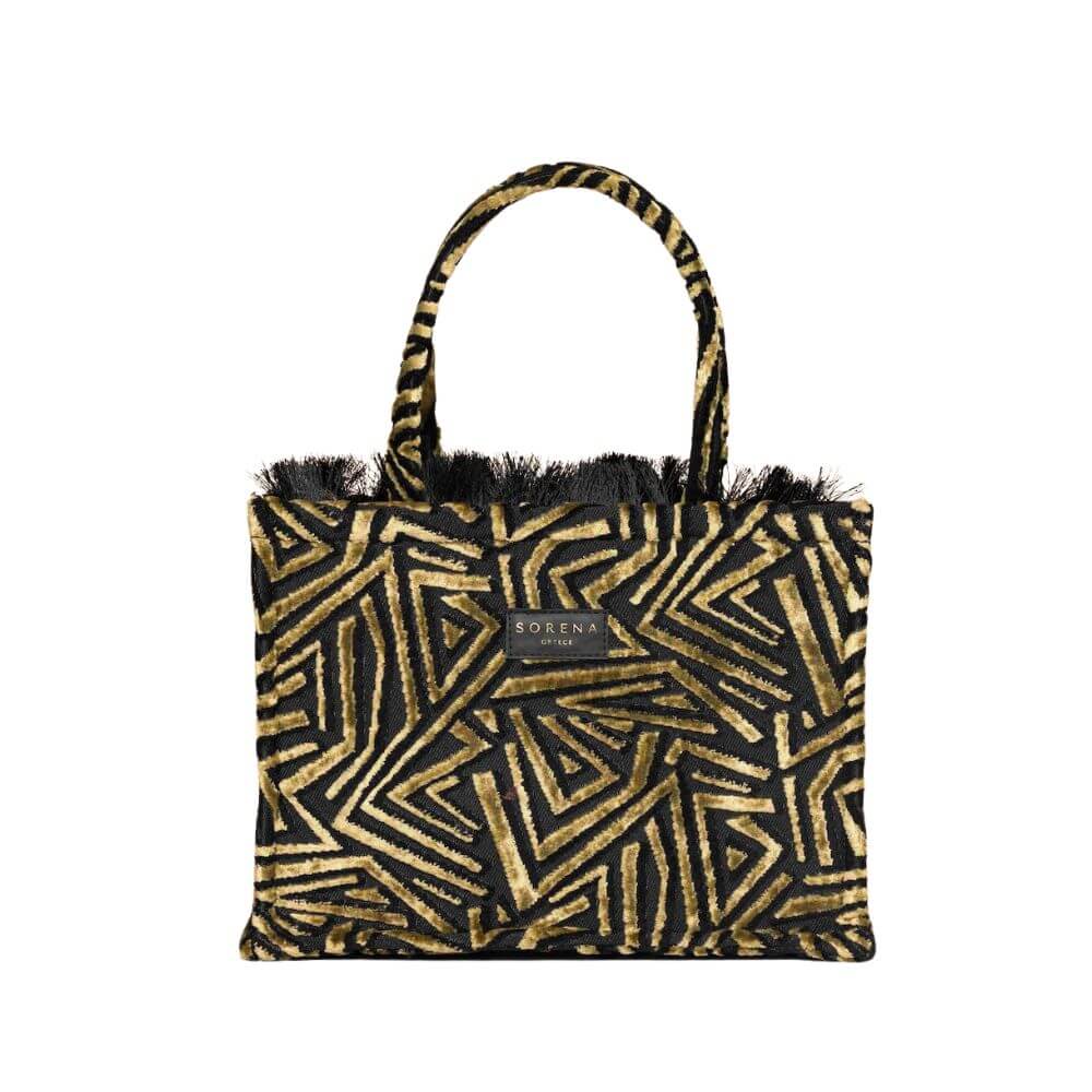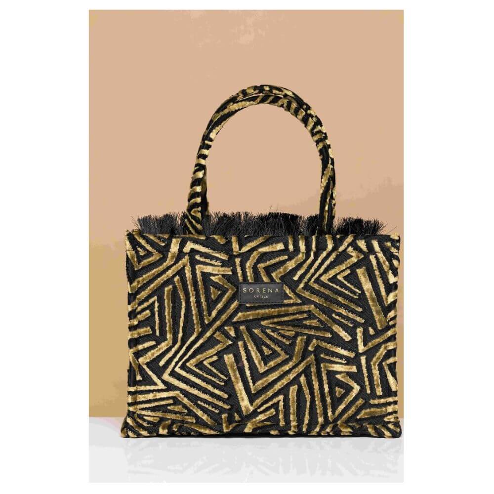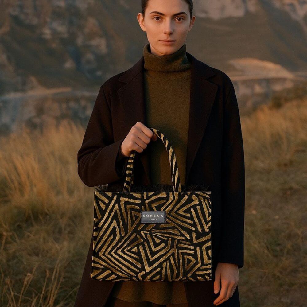 Γυναικεία τσάντα tote Sorena Handmade με κωδικό Sylvana Medium Tote, σε κομψό συνδυασμό μαύρου και απαλού μουσταρδί. Κατασκευασμένη με μοναδική φροντίδα στη λεπτομέρεια, συνδυάζει κομψότητα και πρακτικότητα, καθιστώντας την ιδανική για όλες τις ώρες της ημέρας.
