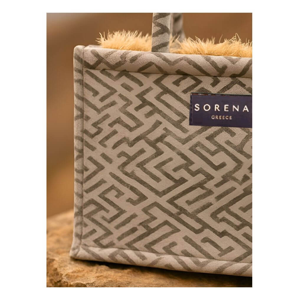 Γυναικεία μπεζ χειροποίητη τσάντα με σχέδιο από την ελληνική εταιρεία Sorena . Διαθέτει εντυπωσιακά κρόσσια και σταθερά χερούλια για άνετο κράτημα ως χειρός, ενώ συνοδεύεται από αποσπώμενο ιμάντα ώστε να μπορεί να φορεθεί και στον ώμο ή χιαστί. Εσωτερικά διαθέτει βελούδινη επένδυση που προσφέρει πολυτέλεια και προστασία στα προσωπικά σας αντικείμενα. Κλείνει με φερμουάρ για μεγαλύτερη ασφάλεια και συνοδεύεται από θήκη φύλαξης για σωστή αποθήκευση. Μια ξεχωριστή και κομψή επιλογή που σίγουρα θα τραβήξει τα βλέμματα!